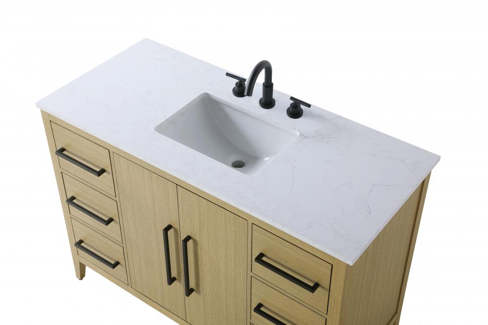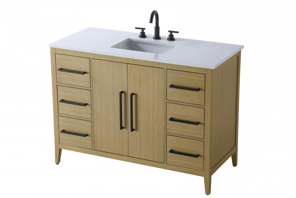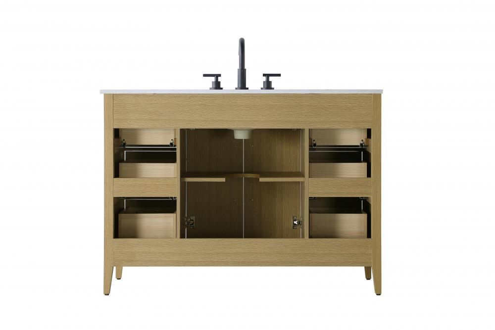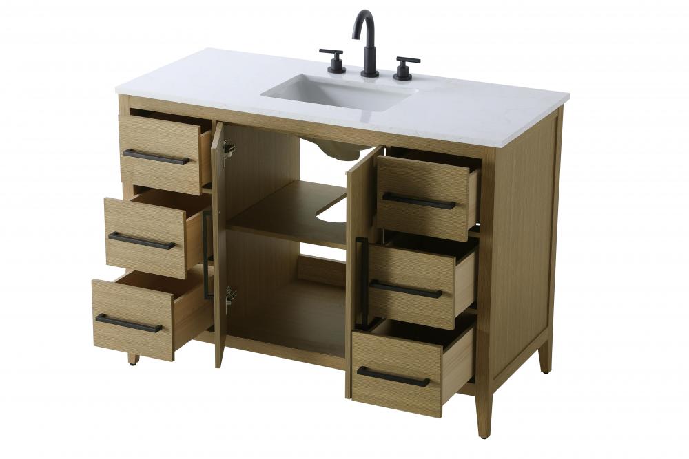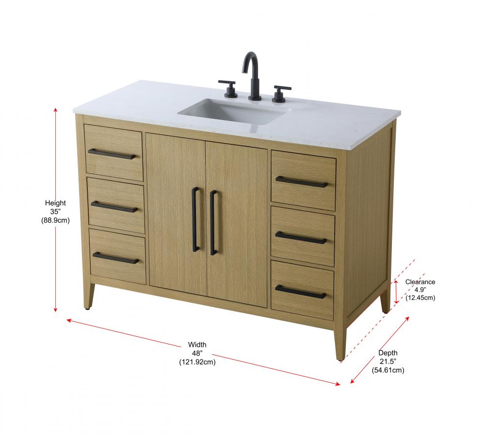 Bring both elegance and practicality to your bathroom with this transitional vanity, available in a selection of rich finishes that highlight the beauty of faux wood grain in shades of mocha, chestnut, and honey, along with classic white and modern grey. The flat door panels and sleek black metal pulls create a minimalist yet refined aesthetic, while the soft-closing drawers and tapered legs with levelers provide smooth, functional operation. Topped with a luxurious white engineered marble countertop and featuring a porcelain sink, this vanity combines timeless style with modern efficiency. Thoughtfully designed with U-shaped cutout for plumbing, it offers ample storage and easy installation, making it the perfect centerpiece for any bathroom.