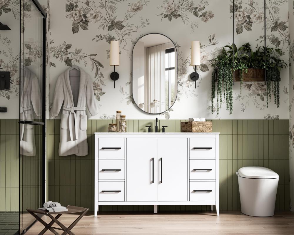 The vanity stands on tapered 5-inch solid wood legs with levelers for a balanced, polished look, combining modern style with practicality.