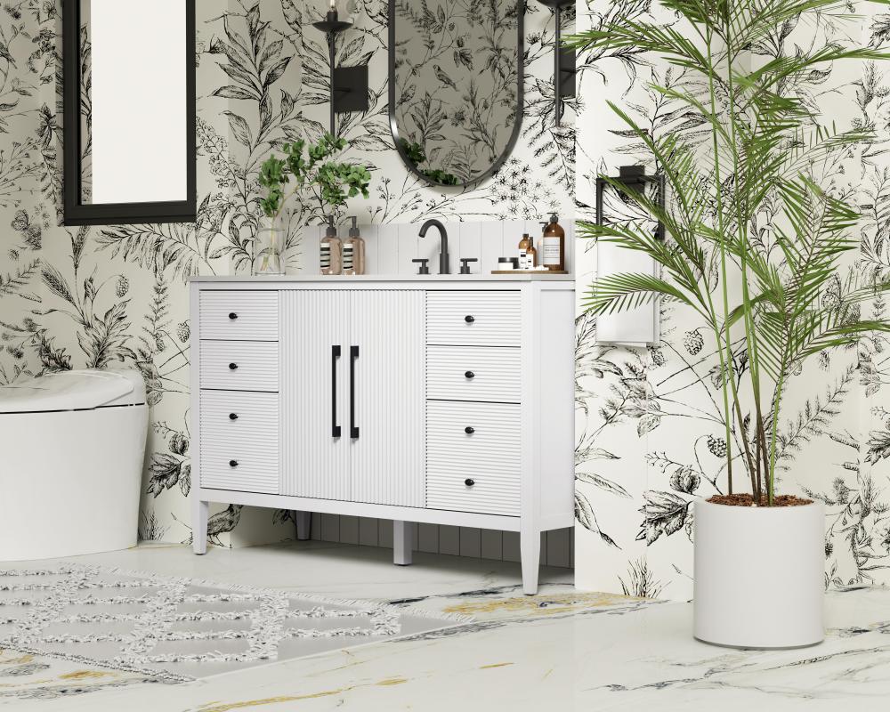 Designed with transitional elegance in mind, this bathroom vanity seamlessly blends traditional elements with modern functionality. Available in five stunning finishes, from the clean sophistication of Crisp White to the natural warmth of Honey Oak, the fluted door and drawer panels add subtle texture and charm. The white engineered marble countertop with natural veining exudes luxury, while the soft-closing doors and drawers with sleek black metal pulls offer a quiet, refined experience. Practicality is never compromised, with features like the U-shaped shelf for plumbing, deeper bottom drawer for ample storage, and pre-drilled faucet holes for easy customization. Whether your style leans modern or classic, this vanity is the perfect balance of beauty and function, appealing to customers with a taste for quality and style.