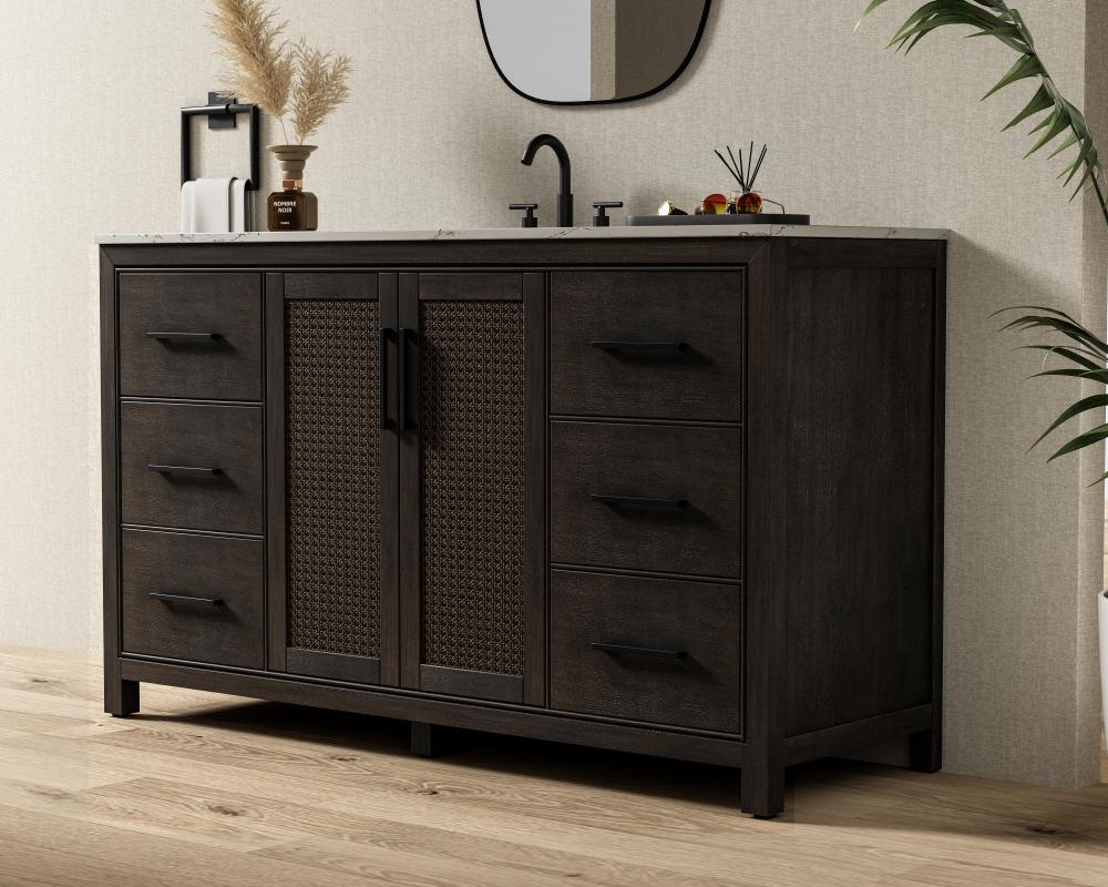 Perfect for those with an eye for detail and quality, this transitional vanity blends modern design with timeless elegance. Available in five stunning finishes, from Crisp White to Linen Oak, the wood grain visuals of the oak options bring warmth and character to any bathroom. The caning design on the Shaker-style door panels adds texture and a touch of refinement, while the soft-closing doors and drawers ensure smooth, quiet functionality. Topped with a white engineered marble countertop, the vanity offers both luxury and practicality, complete with pre-drilled faucet holes for customization. A concealed overflow and U-shaped shelf for plumbing make installation effortless, and the slender black metal pulls provide a sleek contrast.