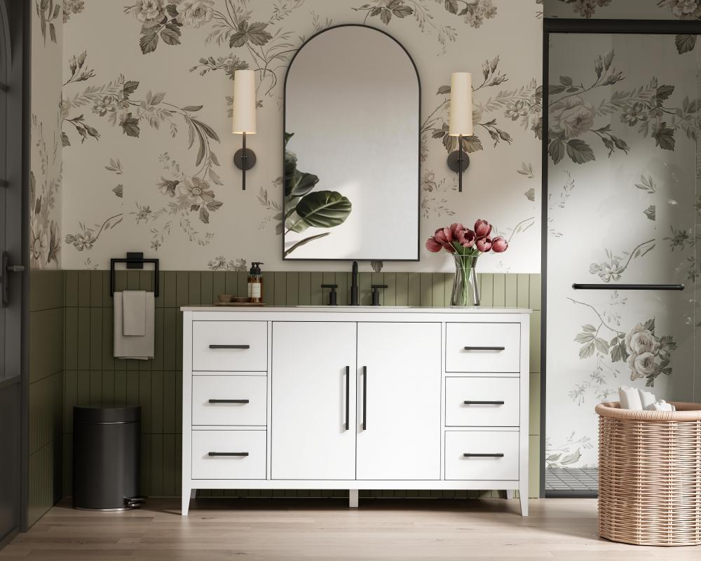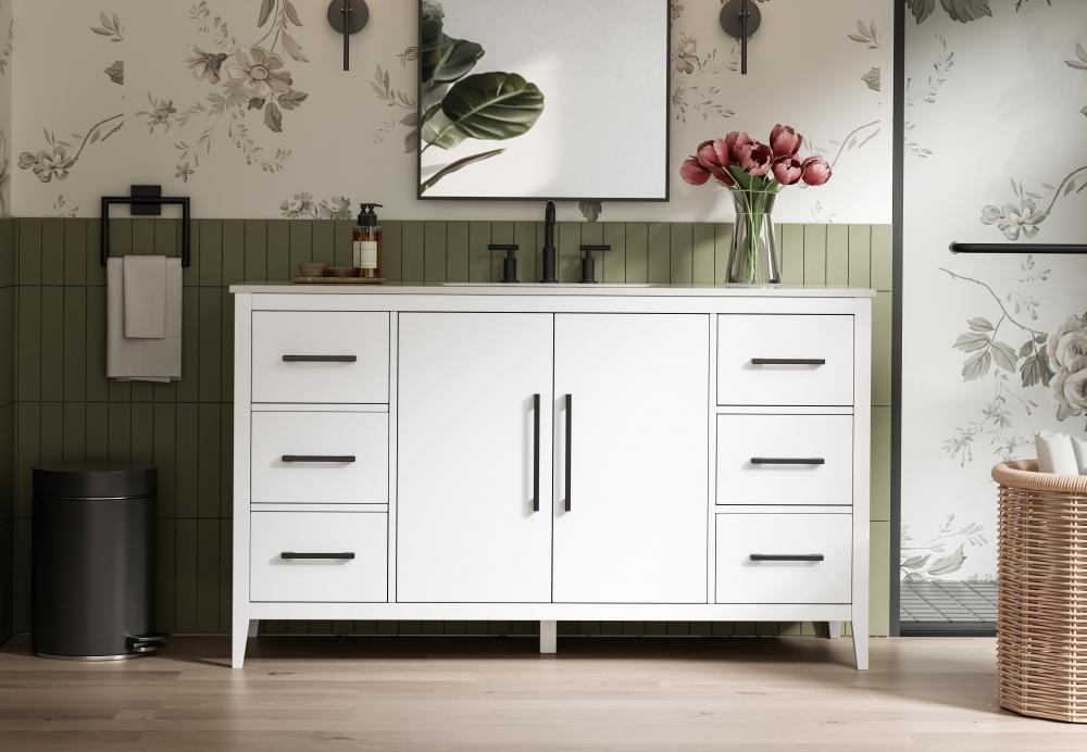 The vanity stands on tapered 5-inch solid wood legs with levelers for a balanced, polished look, combining modern style with practicality.