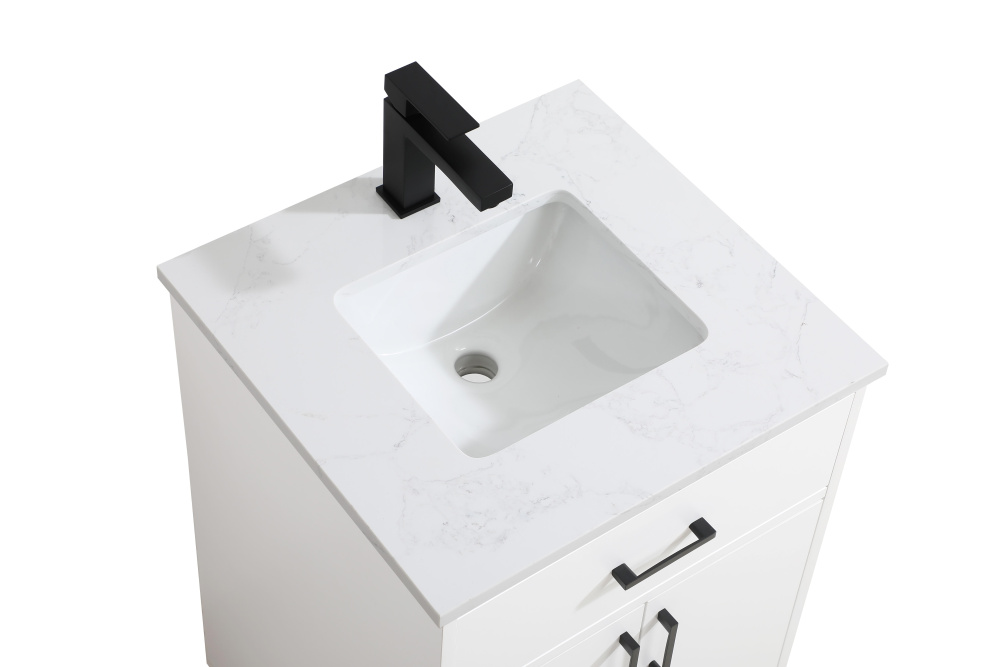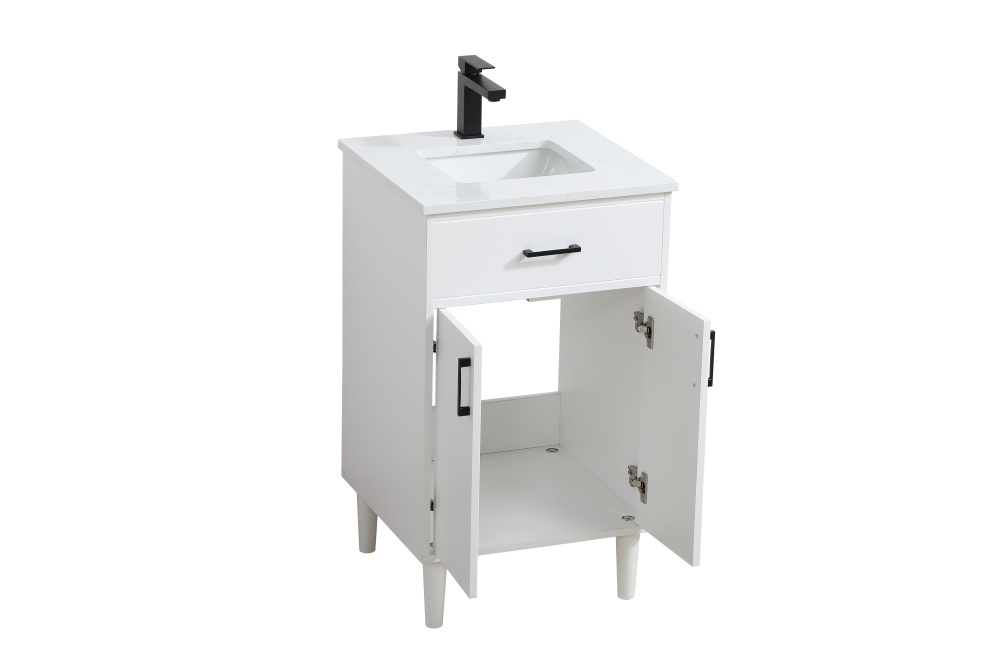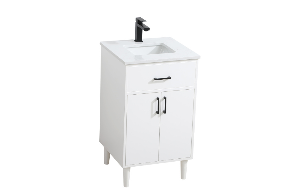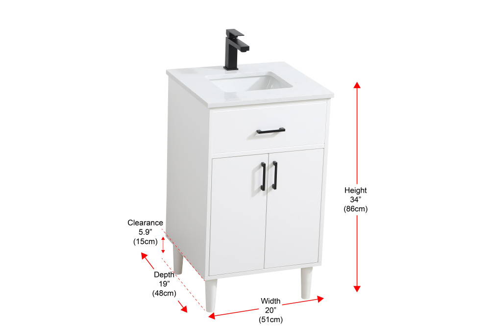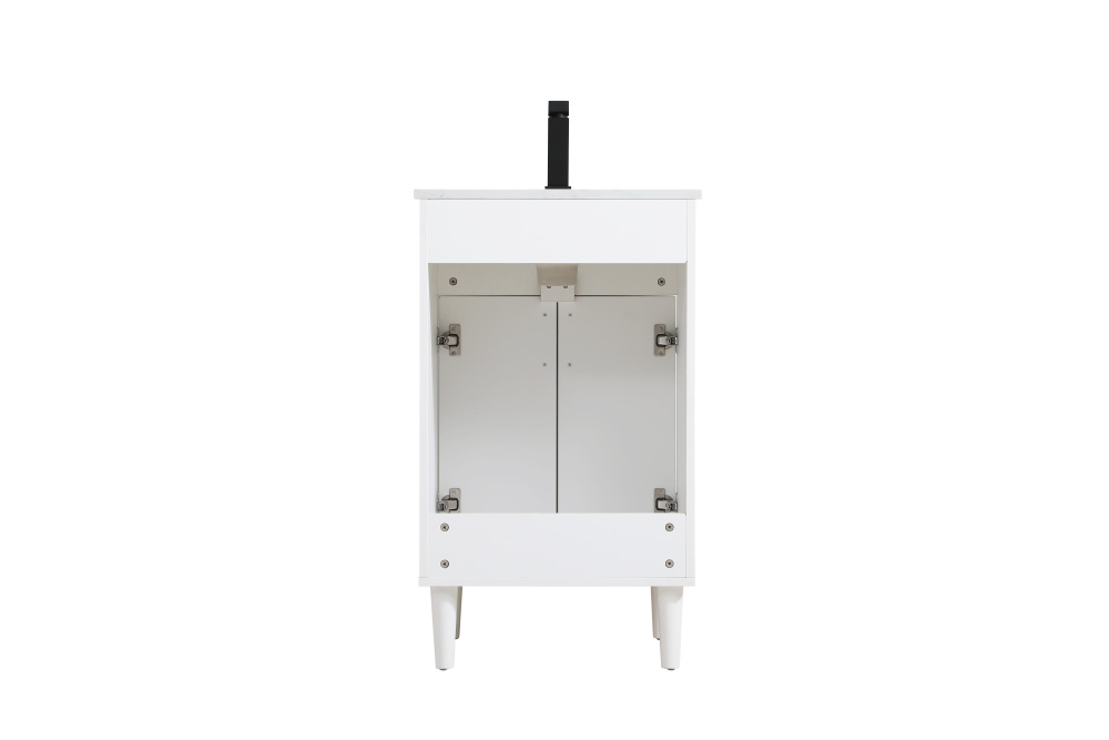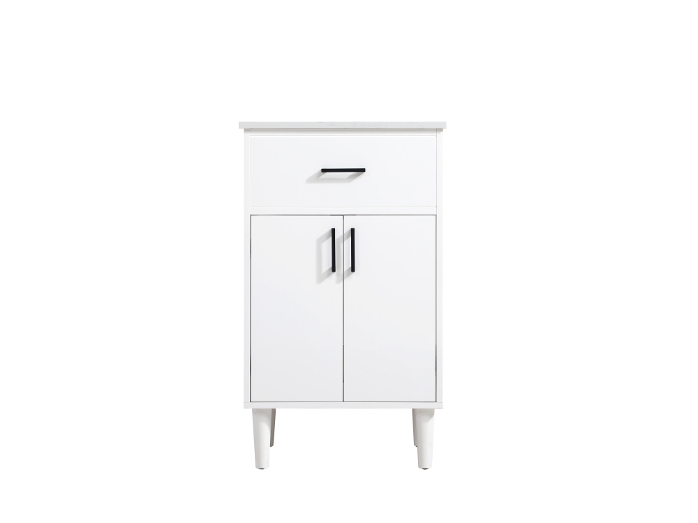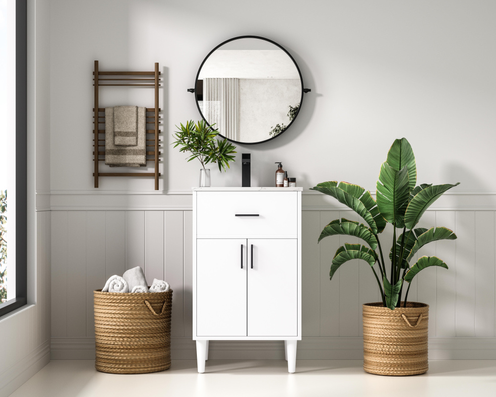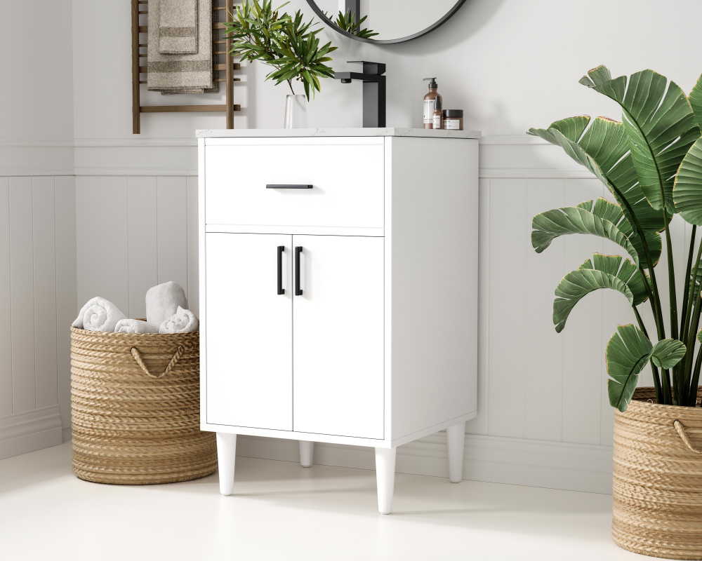 Transform your bathroom with this mid-century modern vanity, designed to bring both functionality and a sense of style to your space. Its clean lines, minimalist design, and tapered solid wood legs evoke a timeless charm, perfect for blending with modern and transitional interiors. The engineered marble countertop, with its unique faux marble veining, adds a refined, luxurious touch, while the porcelain sink is both durable and easy to maintain. Practicality meets aesthetics with a faux drawer for balanced design and a spacious double-door cabinet for efficient storage. Constructed from solid wood and MDF, this vanity offers lasting durability, while adjustable foot levelers ensure stability on any floor. Shipped mostly assembled, the solid wood legs can be effortlessly twisted into place, making installation quick and hassle-free.