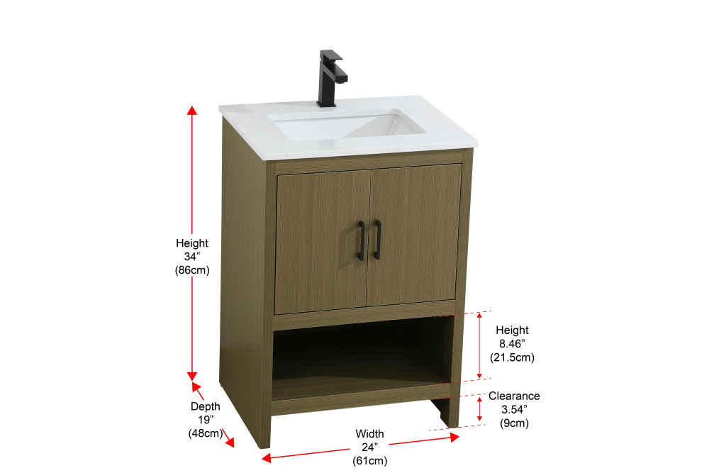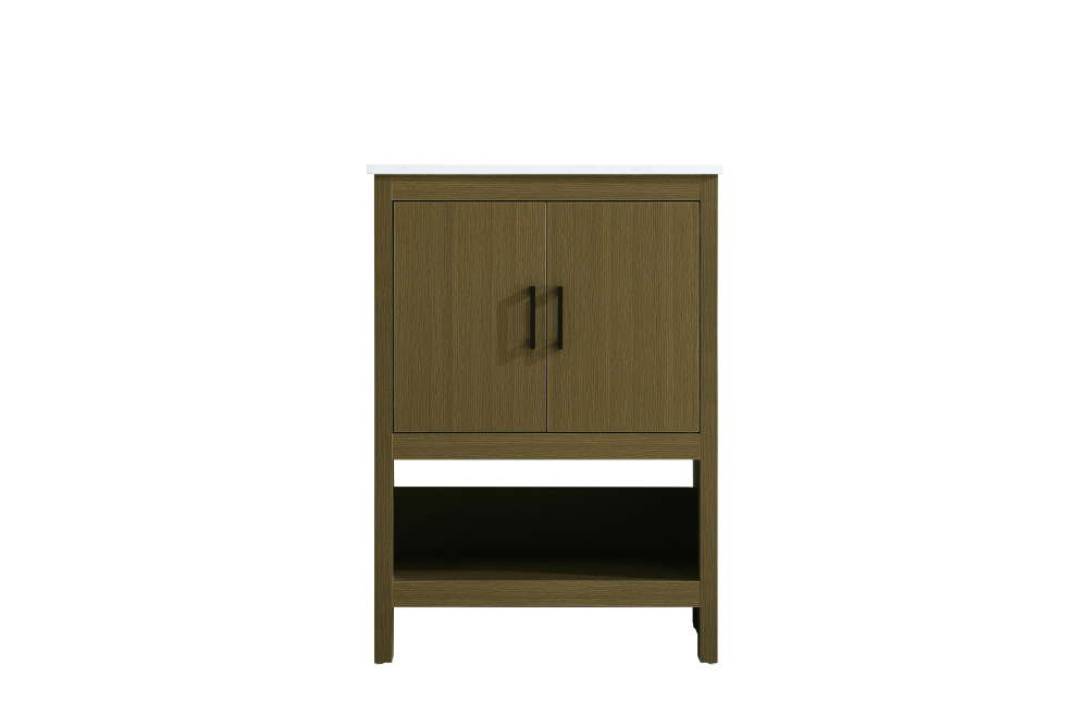Bring modern style and practicality to your bathroom with this sleek vanity, designed to complement contemporary spaces. The flat-panel doors create a clean, minimalist look, while the open bottom shelf provides functional storage or a space to display decorative items. The engineered marble countertop showcases unique faux marbling, adding a refined and distinct touch to the design. The durable porcelain sink is easy to maintain, and the single pre-drilled faucet hole simplifies the installation process. Constructed from high-quality MDF with a versatile woodgrain finish, this vanity combines durability with timeless style. With adjustable foot levelers for stability on uneven floors and a fully assembled design, this piece offers a seamless addition to your bathroom.