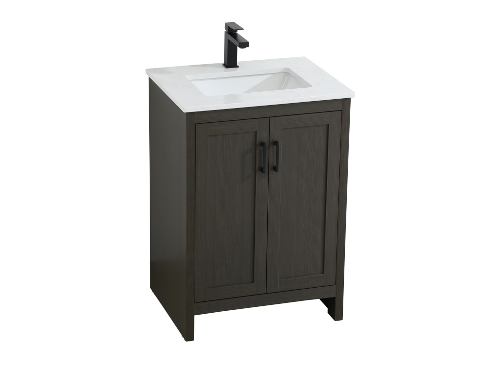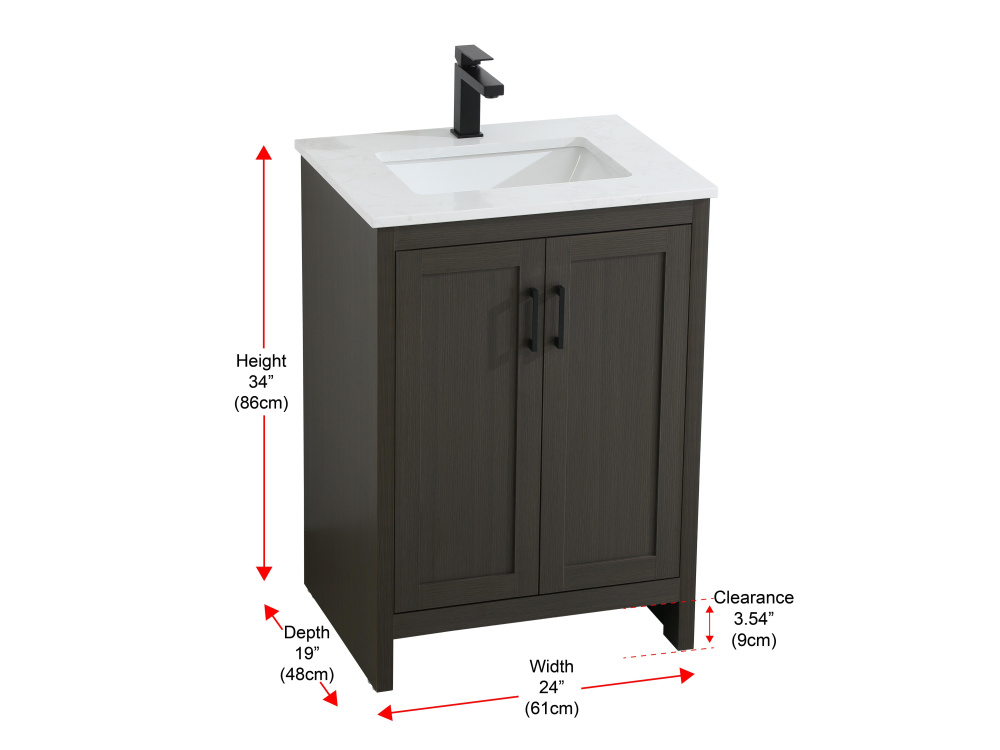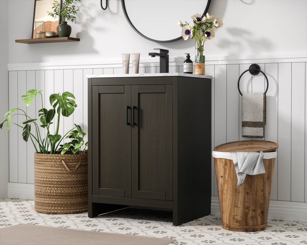 Redefine your bathroom with this transitional shaker-style vanity, designed to combine practicality with timeless aesthetics. Its clean lines and shaker-style door panels create a versatile look that complements both traditional and contemporary spaces. The engineered marble countertop, featuring a unique faux marbled pattern, adds a sophisticated focal point, while the integrated porcelain sink ensures durability and easy maintenance. The vanity includes a shelf with a smart U-shaped cutout, optimizing storage while accommodating plumbing. Crafted from sturdy MDF with a warm woodgrain finish, it brings a natural and inviting feel to your bathroom. Equipped with adjustable foot levelers for stability and a pre-drilled faucet hole for quick installation, this compact vanity delivers on both style and function. Best of all, it arrives fully assembled, ready to enhance your space right out of the box.
