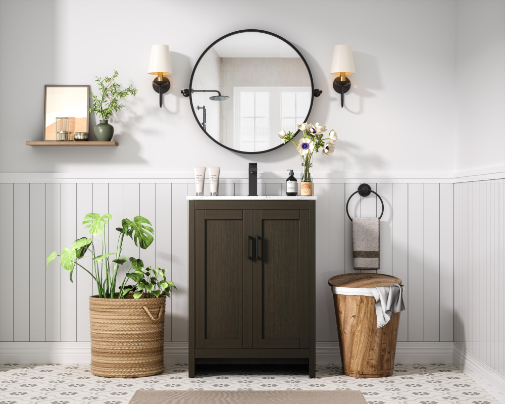 A natural wood-inspired finish adds warmth and texture to your bathroom.