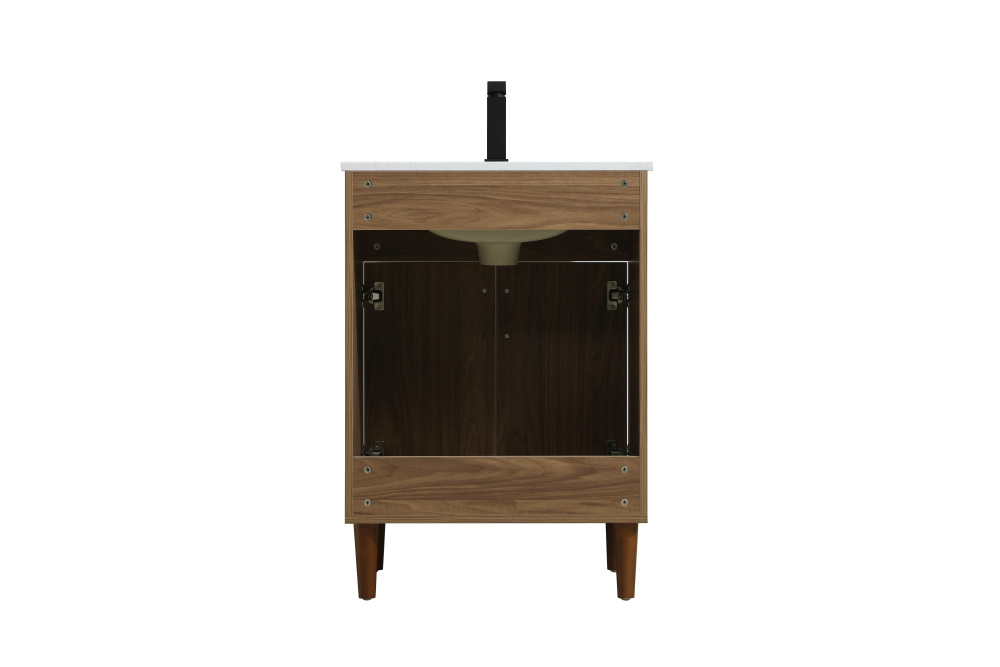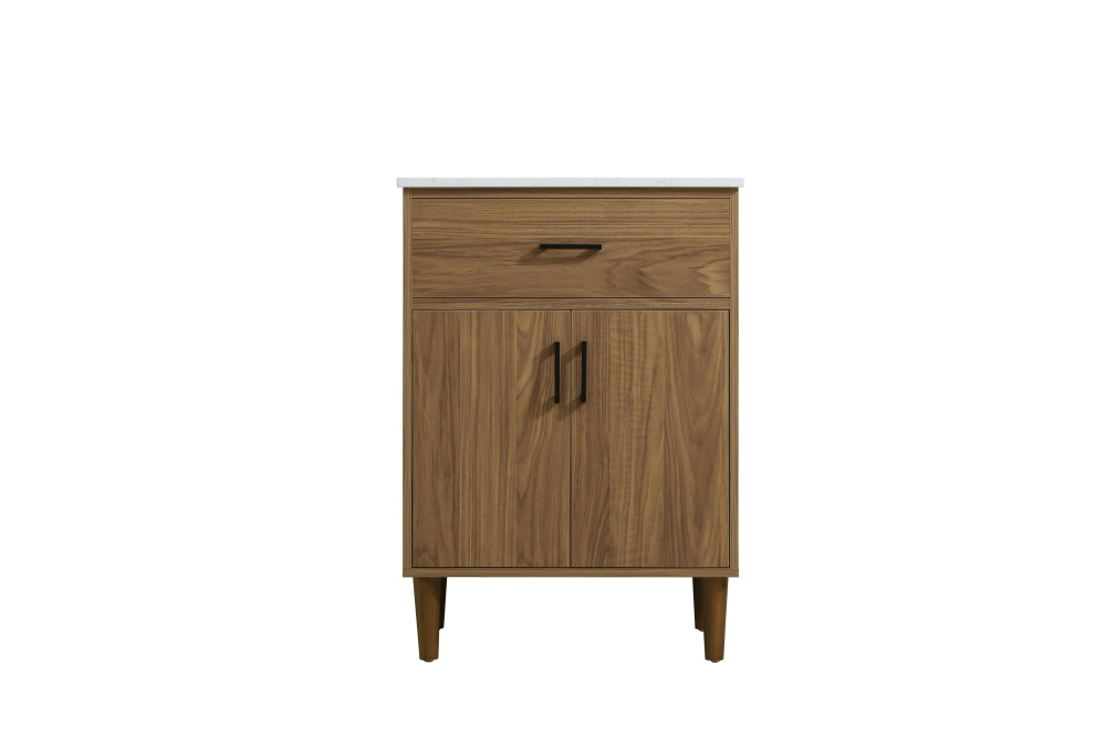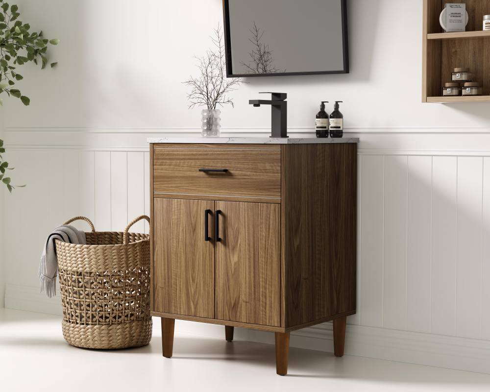 Transform your bathroom with this mid-century modern vanity, designed to bring both functionality and a sense of style to your space. Its clean lines, minimalist design, and tapered solid wood legs evoke a timeless charm, perfect for blending with modern and transitional interiors. The engineered marble countertop, with its unique faux marble veining, adds a refined, luxurious touch, while the porcelain sink is both durable and easy to maintain. Practicality meets aesthetics with a faux drawer for balanced design and a spacious double-door cabinet for efficient storage. Constructed from solid wood and MDF, this vanity offers lasting durability, while adjustable foot levelers ensure stability on any floor. Shipped mostly assembled, the solid wood legs can be effortlessly twisted into place, making installation quick and hassle-free.