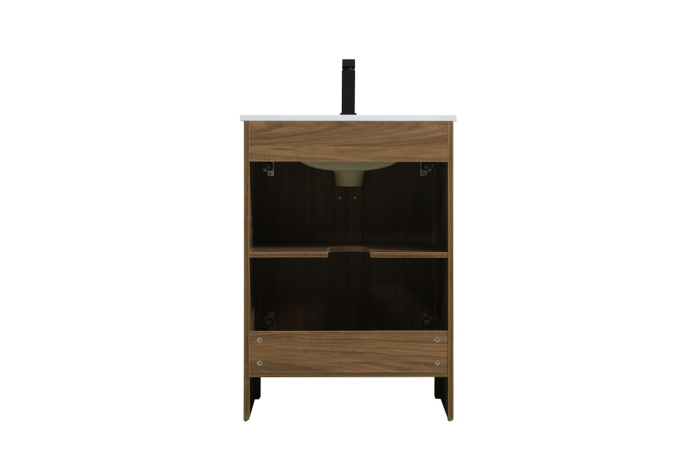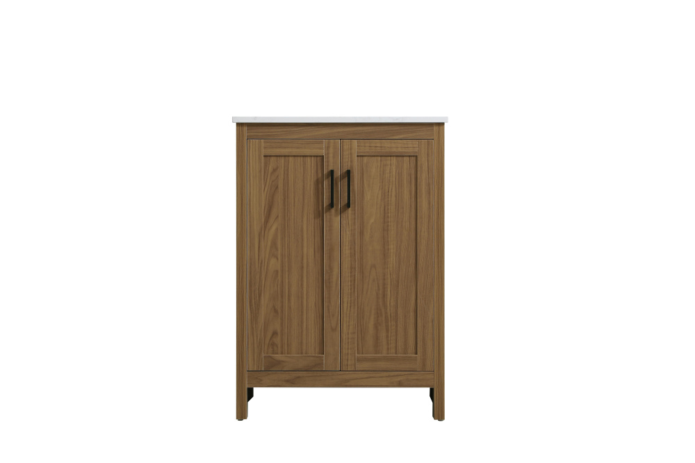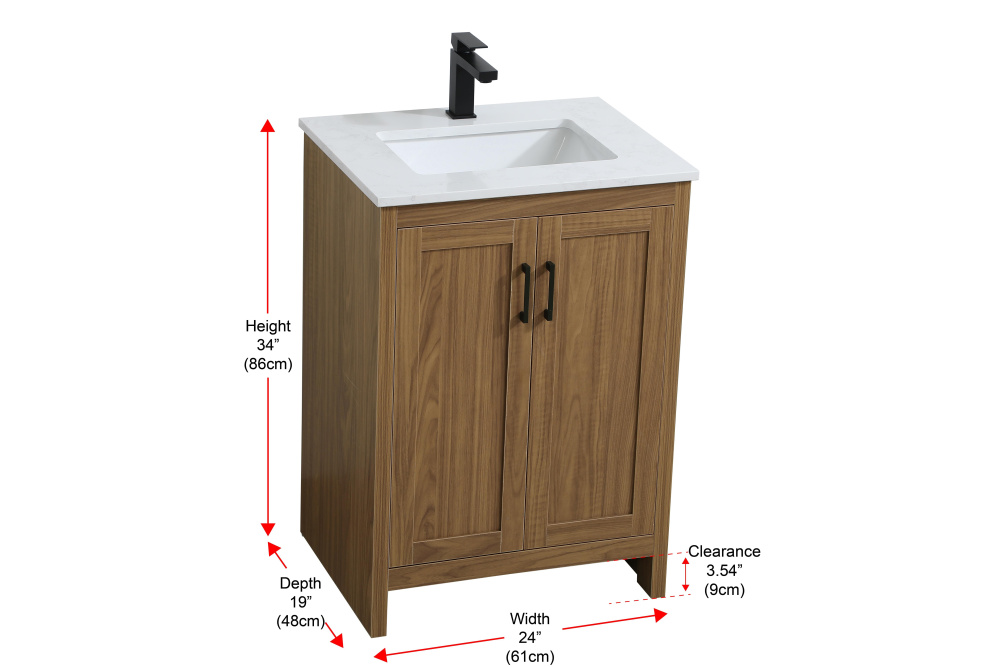 Redefine your bathroom with this transitional shaker-style vanity, designed to combine practicality with timeless aesthetics. Its clean lines and shaker-style door panels create a versatile look that complements both traditional and contemporary spaces. The engineered marble countertop, featuring a unique faux marbled pattern, adds a sophisticated focal point, while the integrated porcelain sink ensures durability and easy maintenance. The vanity includes a shelf with a smart U-shaped cutout, optimizing storage while accommodating plumbing. Crafted from sturdy MDF with a warm woodgrain finish, it brings a natural and inviting feel to your bathroom. Equipped with adjustable foot levelers for stability and a pre-drilled faucet hole for quick installation, this compact vanity delivers on both style and function. Best of all, it arrives fully assembled, ready to enhance your space right out of the box.