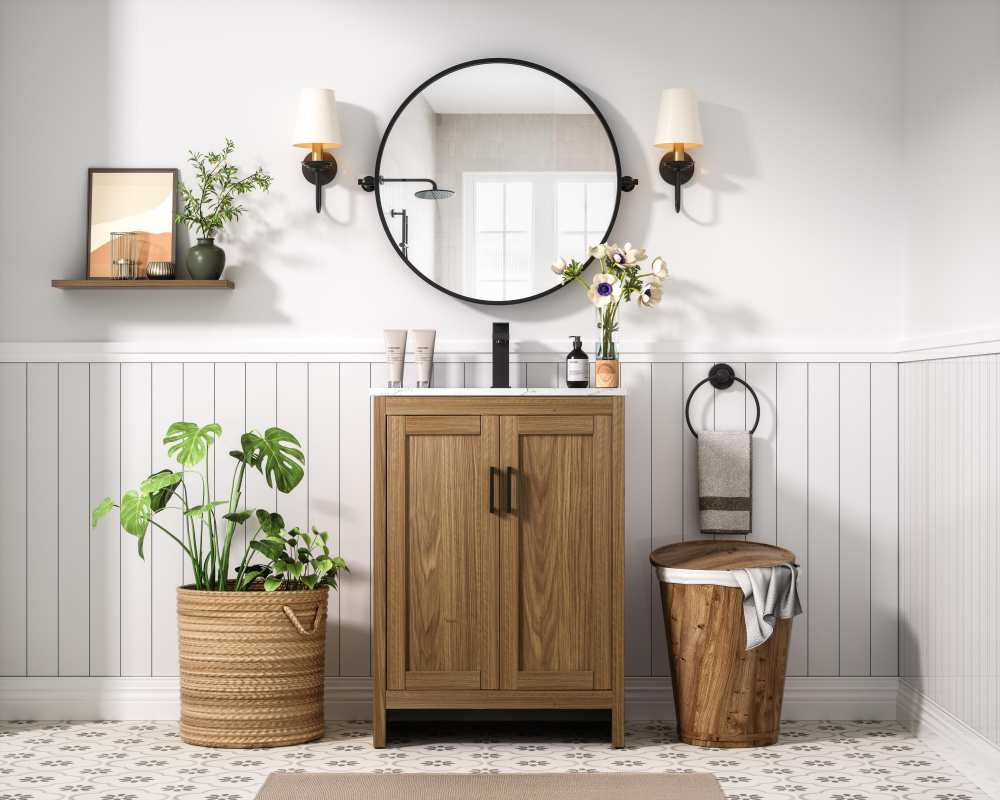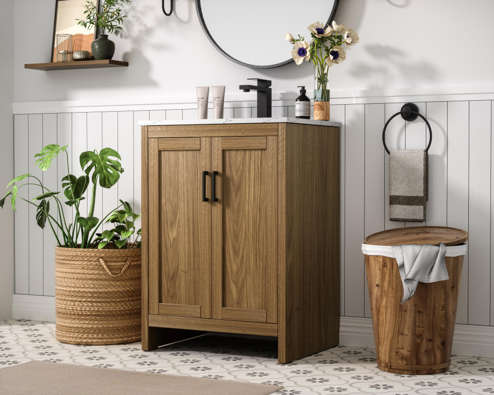 A natural wood-inspired finish adds warmth and texture to your bathroom.