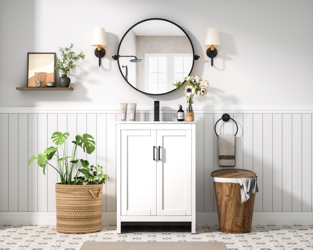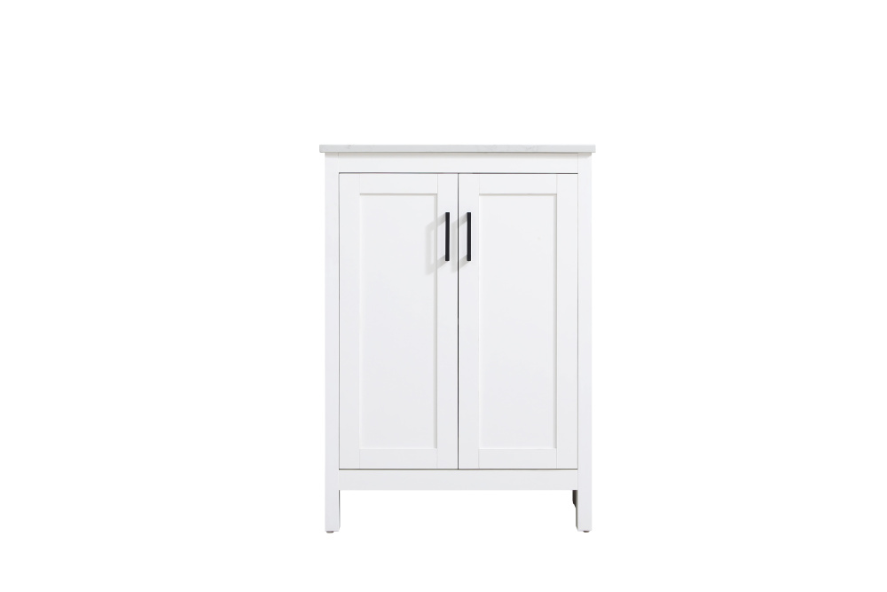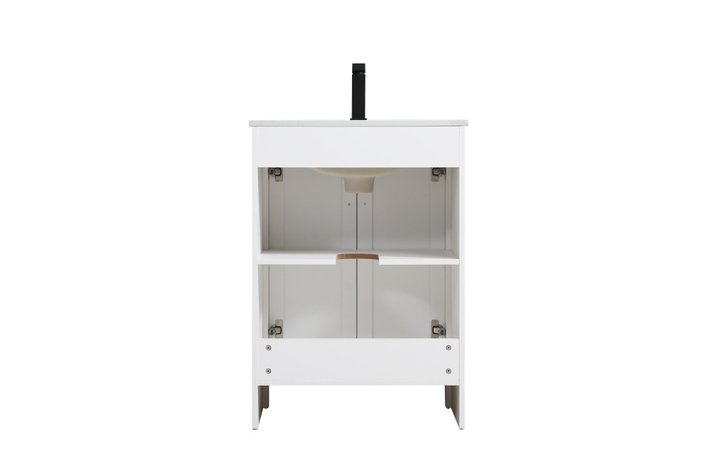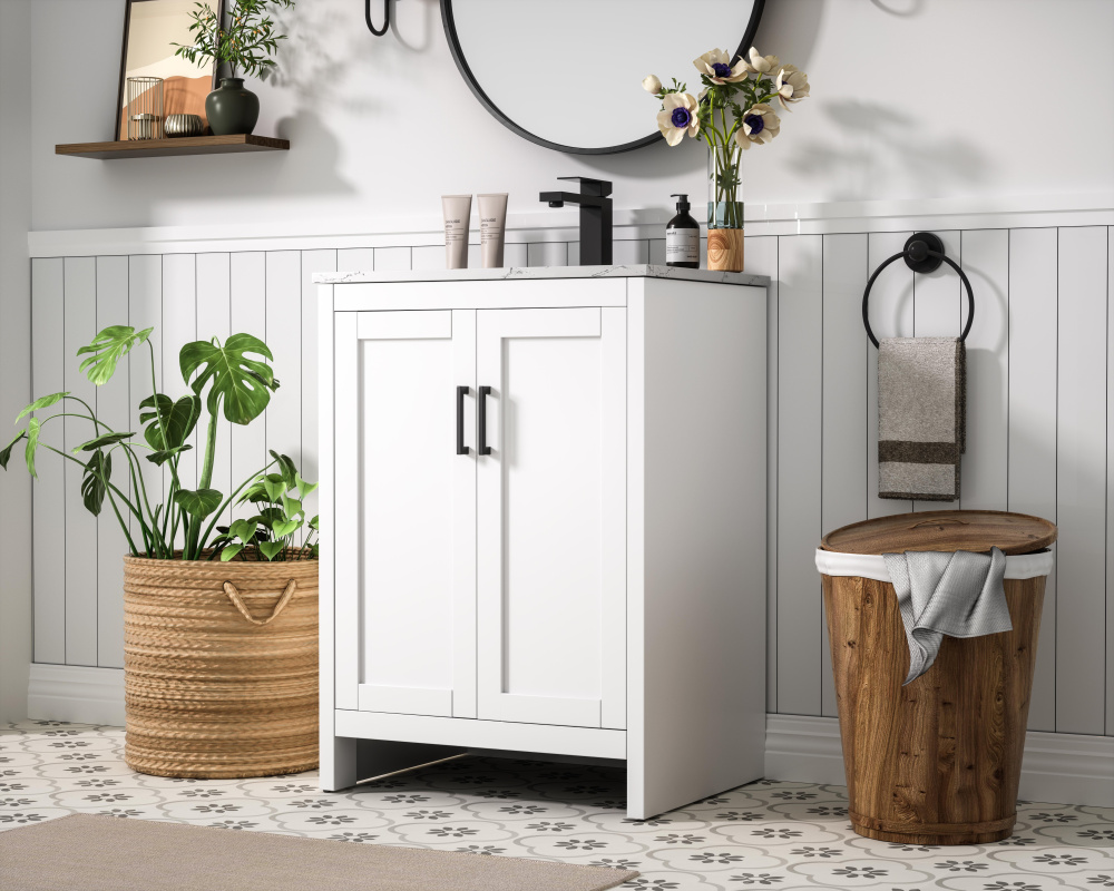 Redefine your bathroom with this transitional shaker-style vanity, designed to combine practicality with timeless aesthetics. Its clean lines and shaker-style door panels create a versatile look that complements both traditional and contemporary spaces. The engineered marble countertop, featuring a unique faux marbled pattern, adds a sophisticated focal point, while the integrated porcelain sink ensures durability and easy maintenance. The vanity includes a shelf with a smart U-shaped cutout, optimizing storage while accommodating plumbing. Crafted from sturdy MDF with a white finish, it brings a clean and inviting feel to your bathroom. Equipped with adjustable foot levelers for stability and a pre-drilled faucet hole for quick installation, this compact vanity delivers on both style and function. Best of all, it arrives fully assembled, ready to enhance your space right out of the box.