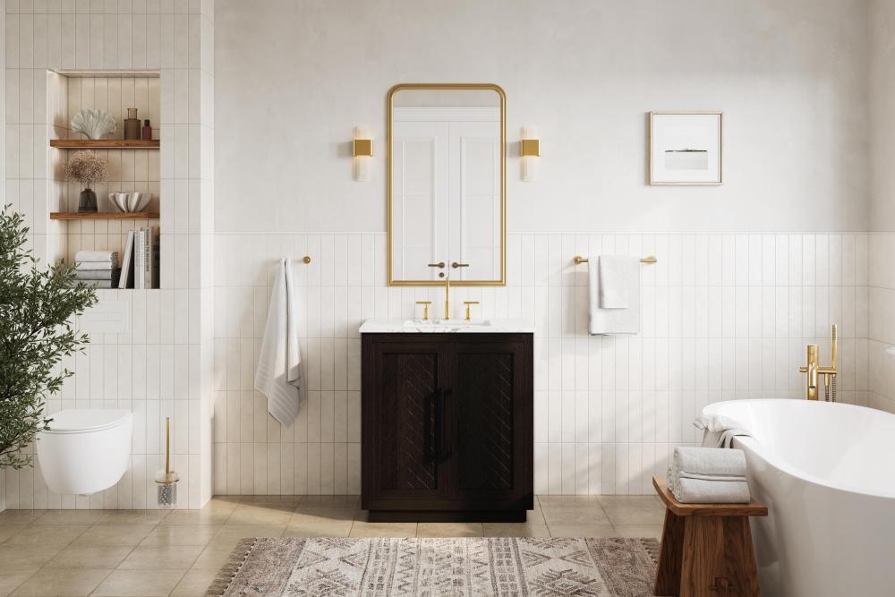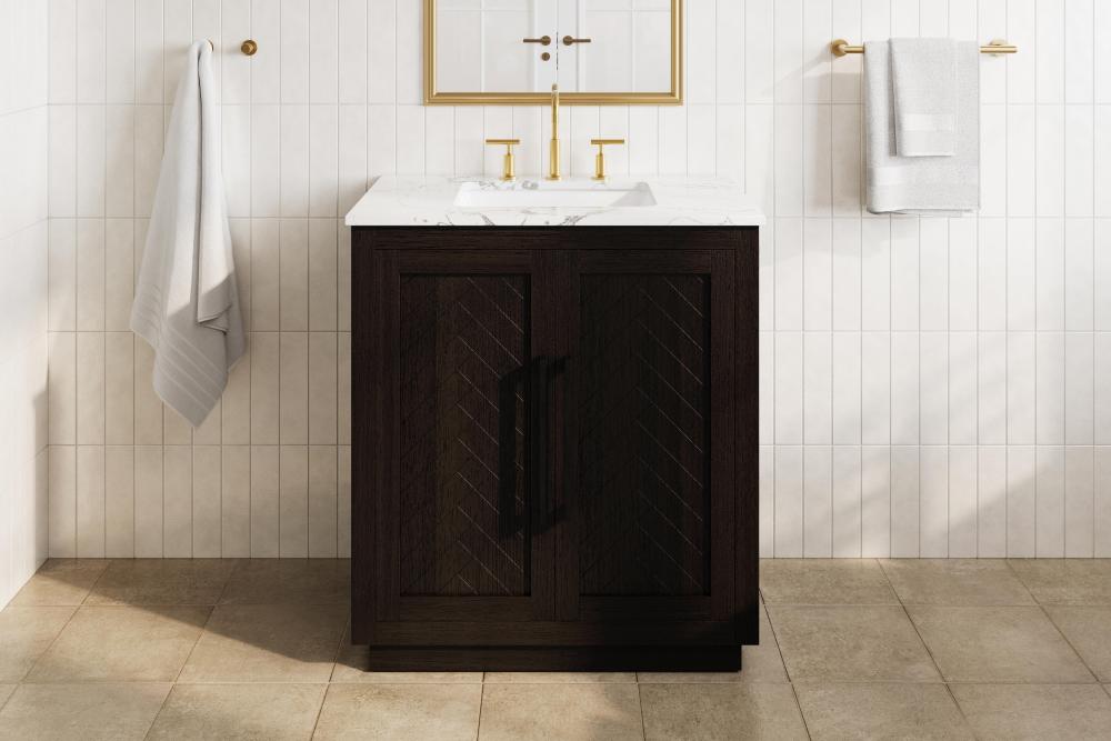 Each finish enhances the unique herringbone design on the Shaker-style door panels, adding a touch of craftsmanship and texture that elevates the overall design of the vanity.