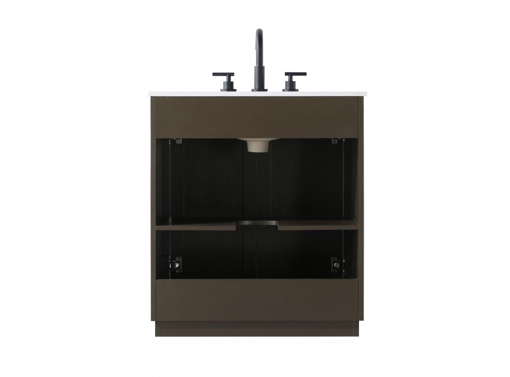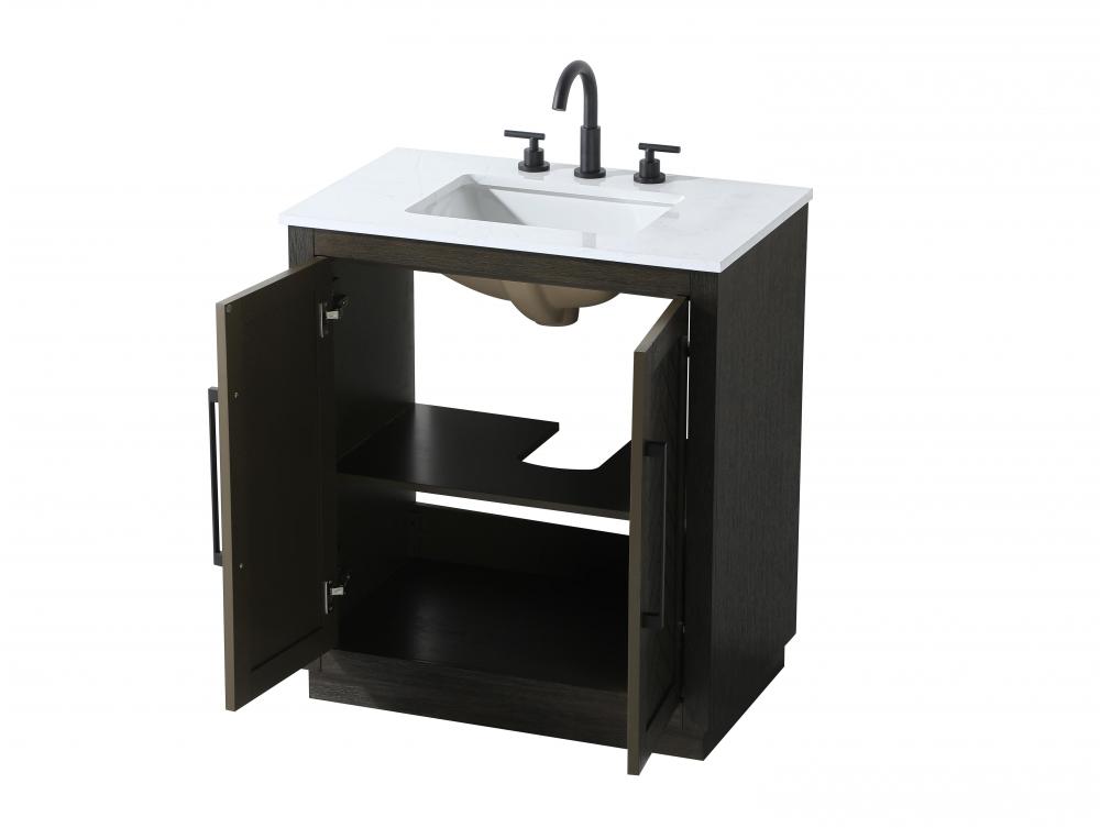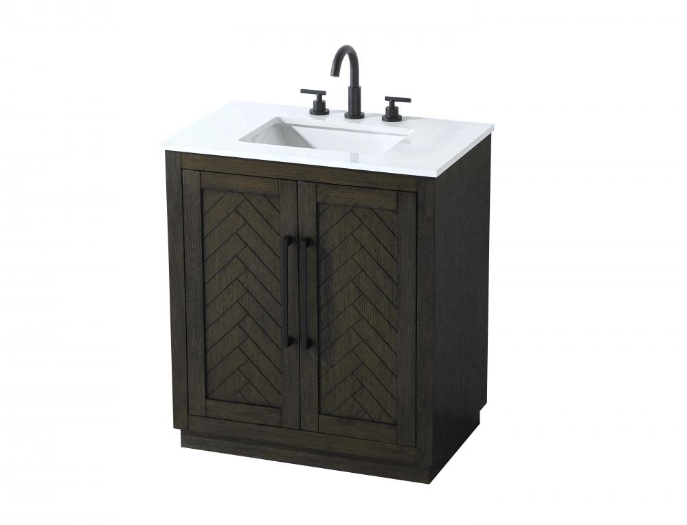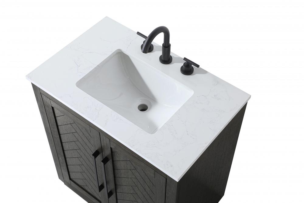 This transitional bathroom vanity offers the perfect blend of timeless style and modern functionality. Available in five refined finishes—crisp white, sleek grey, chocolate oak, honey oak, and linen oak—it complements a range of decor styles, from classic to contemporary. The stunning herringbone design on the Shaker-style door panels adds texture and craftsmanship to the piece. Topped with a white engineered marble countertop featuring subtle veining, it provides both beauty and durability. The long black metal pulls on the soft-closing doors add sleek, modern detailing. Practical features include a concealed overflow, a back panel cutout for easy plumbing installation, and a U-shaped cutout shelf to fit plumbing while maximizing storage space. with a toe kick all around the base, this vanity is thoughtfully designed to blend form and function in any bathroom setting.