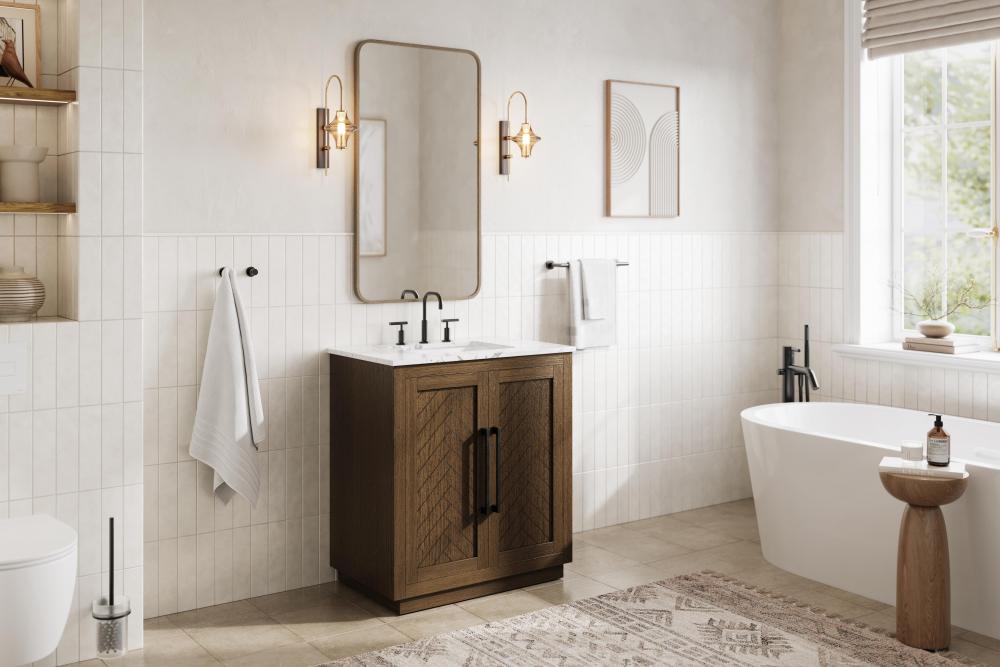 The vanity includes a concealed overflow, keeping the design sleek and uninterrupted, while ensuring practical overflow protection.