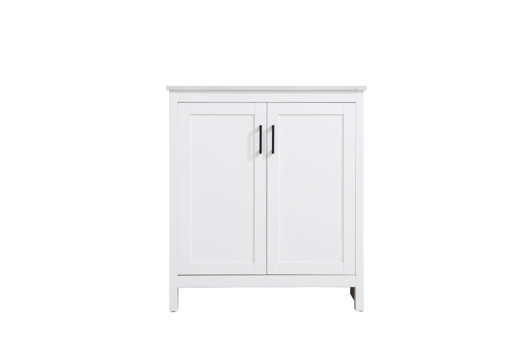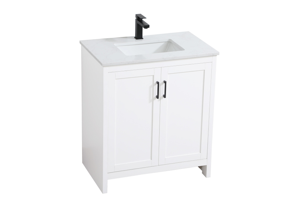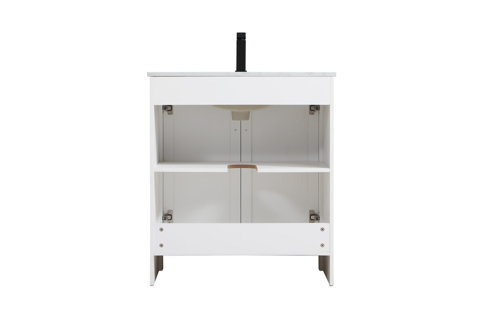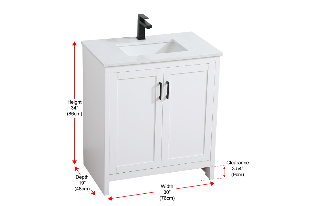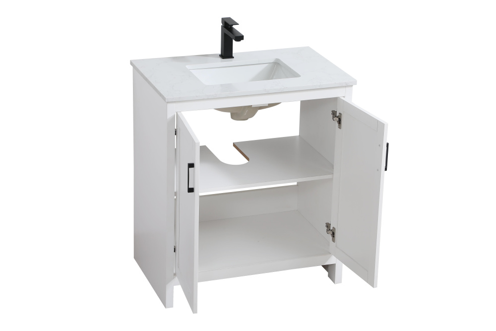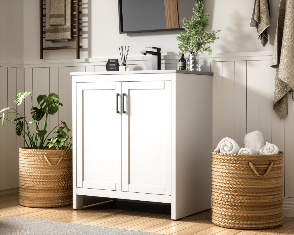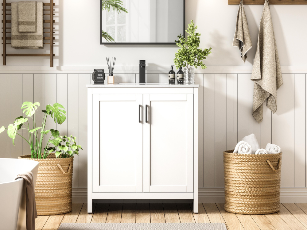 Redefine your bathroom with this transitional shaker-style vanity, designed to combine practicality with timeless aesthetics. Its clean lines and shaker-style door panels create a versatile look that complements both traditional and contemporary spaces. The engineered marble countertop, featuring a unique faux marbled pattern, adds a sophisticated focal point, while the integrated porcelain sink ensures durability and easy maintenance. The vanity includes a shelf with a smart U-shaped cutout, optimizing storage while accommodating plumbing. Crafted from sturdy MDF with a white finish, it brings a clean and inviting feel to your bathroom. Equipped with adjustable foot levelers for stability and a pre-drilled faucet hole for quick installation, this compact vanity delivers on both style and function. Best of all, it arrives fully assembled, ready to enhance your space right out of the box.