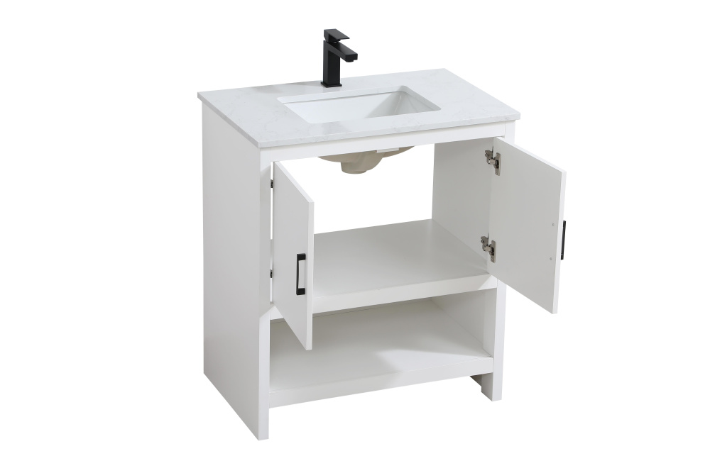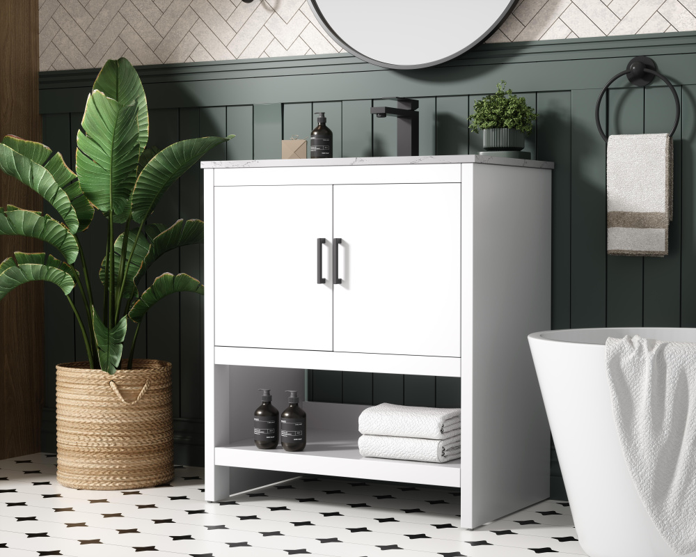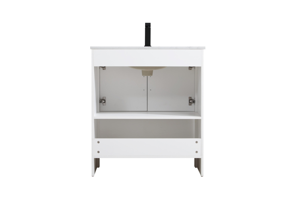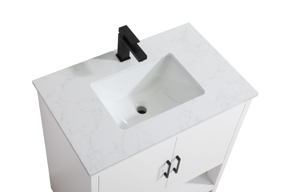 Bring modern style and practicality to your bathroom with this sleek vanity, designed to complement contemporary spaces. The flat-panel doors create a clean, minimalist look, while the open bottom shelf provides functional storage or a space to display decorative items. The engineered marble countertop showcases unique faux marbling, adding a refined and distinct touch to the design. The durable porcelain sink is easy to maintain, and the single pre-drilled faucet hole simplifies the installation process. Constructed from high-quality MDF with a versatile white finish, this vanity combines durability with timeless style. With adjustable foot levelers for stability on uneven floors and a fully assembled design, this piece offers a seamless addition to your bathroom.
