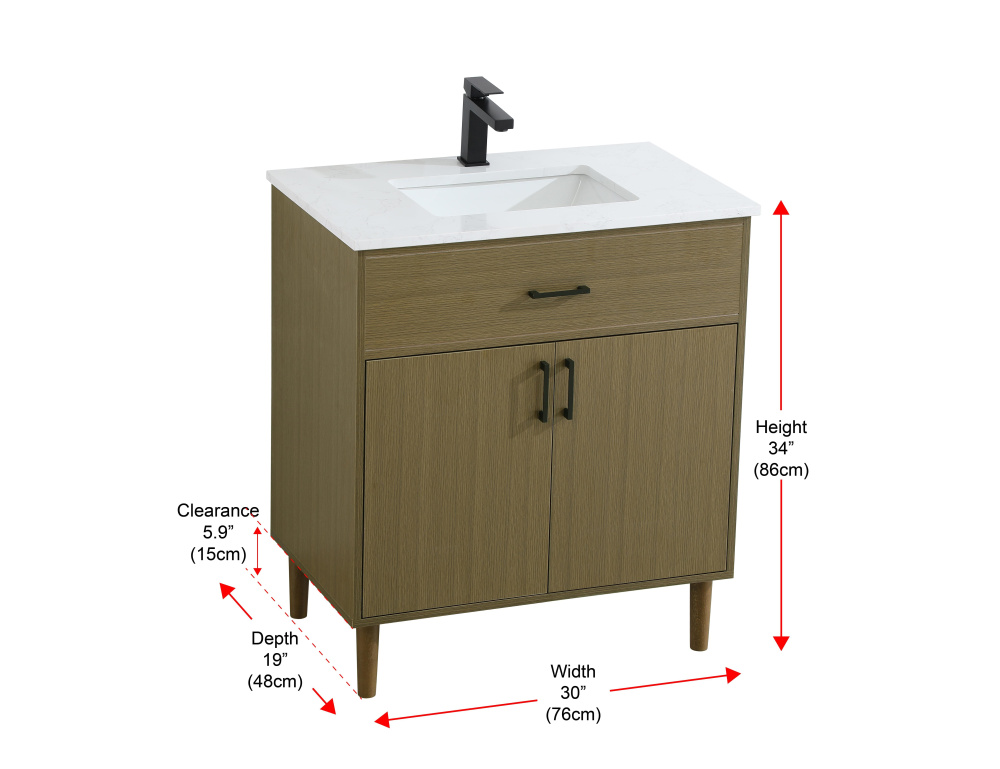 Transform your bathroom with this mid-century modern vanity, designed to bring both functionality and a sense of style to your space. Its clean lines, minimalist design, and tapered solid wood legs evoke a timeless charm, perfect for blending with modern and transitional interiors. The engineered marble countertop, with its unique faux marble veining, adds a refined, luxurious touch, while the porcelain sink is both durable and easy to maintain. Practicality meets aesthetics with a faux drawer for balanced design and a spacious double-door cabinet for efficient storage. Constructed from solid wood and MDF, this vanity offers lasting durability, while adjustable foot levelers ensure stability on any floor. Shipped mostly assembled, the solid wood legs can be effortlessly twisted into place, making installation quick and hassle-free.