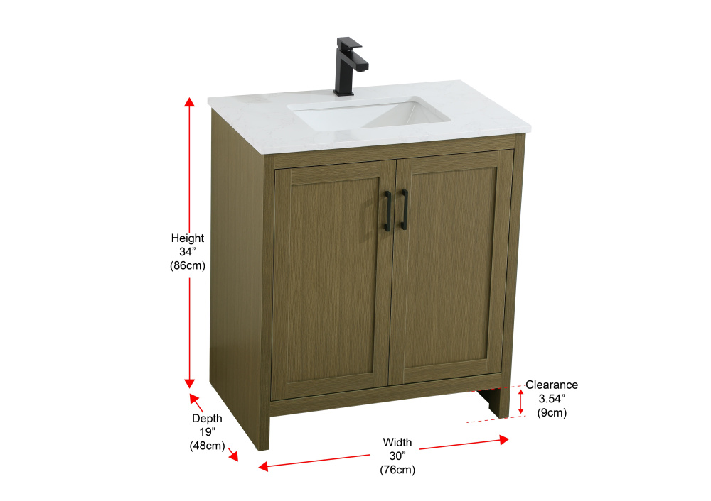 Redefine your bathroom with this transitional shaker-style vanity, designed to combine practicality with timeless aesthetics. Its clean lines and shaker-style door panels create a versatile look that complements both traditional and contemporary spaces. The engineered marble countertop, featuring a unique faux marbled pattern, adds a sophisticated focal point, while the integrated porcelain sink ensures durability and easy maintenance. The vanity includes a shelf with a smart U-shaped cutout, optimizing storage while accommodating plumbing. Crafted from sturdy MDF with a warm woodgrain finish, it brings a natural and inviting feel to your bathroom. Equipped with adjustable foot levelers for stability and a pre-drilled faucet hole for quick installation, this compact vanity delivers on both style and function. Best of all, it arrives fully assembled, ready to enhance your space right out of the box.