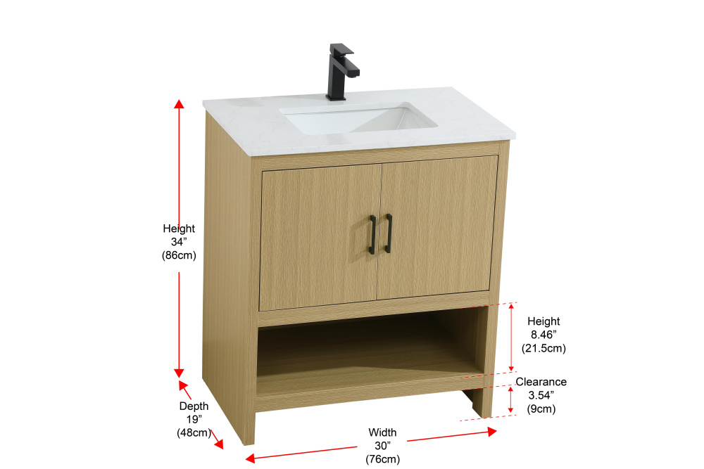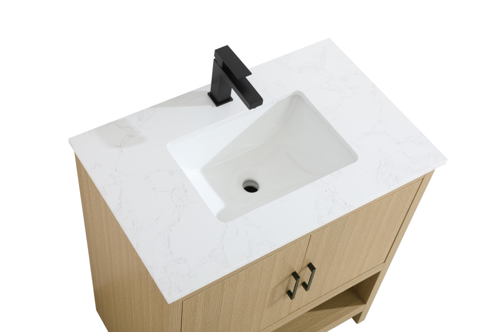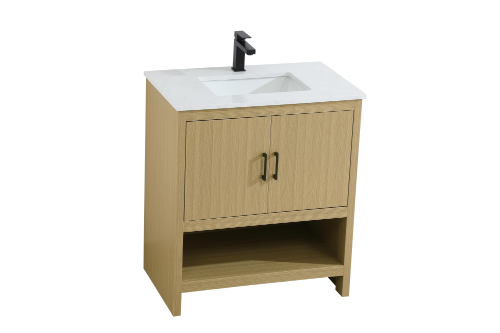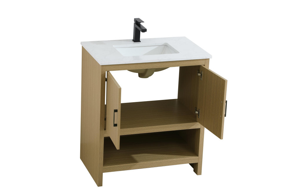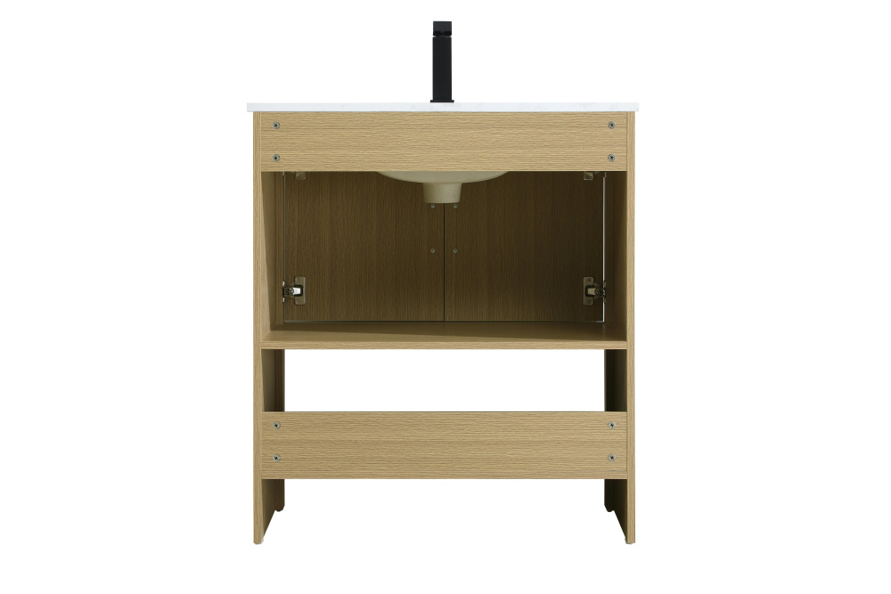 Bring modern style and practicality to your bathroom with this sleek vanity, designed to complement contemporary spaces. The flat-panel doors create a clean, minimalist look, while the open bottom shelf provides functional storage or a space to display decorative items. The engineered marble countertop showcases unique faux marbling, adding a refined and distinct touch to the design. The durable porcelain sink is easy to maintain, and the single pre-drilled faucet hole simplifies the installation process. Constructed from high-quality MDF with a versatile woodgrain finish, this vanity combines durability with timeless style. With adjustable foot levelers for stability on uneven floors and a fully assembled design, this piece offers a seamless addition to your bathroom.