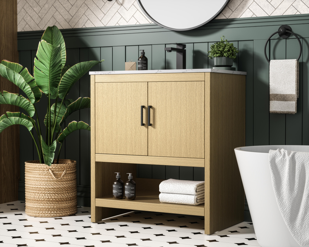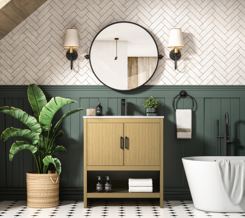 A natural wood-inspired finish adds warmth and texture to your bathroom.