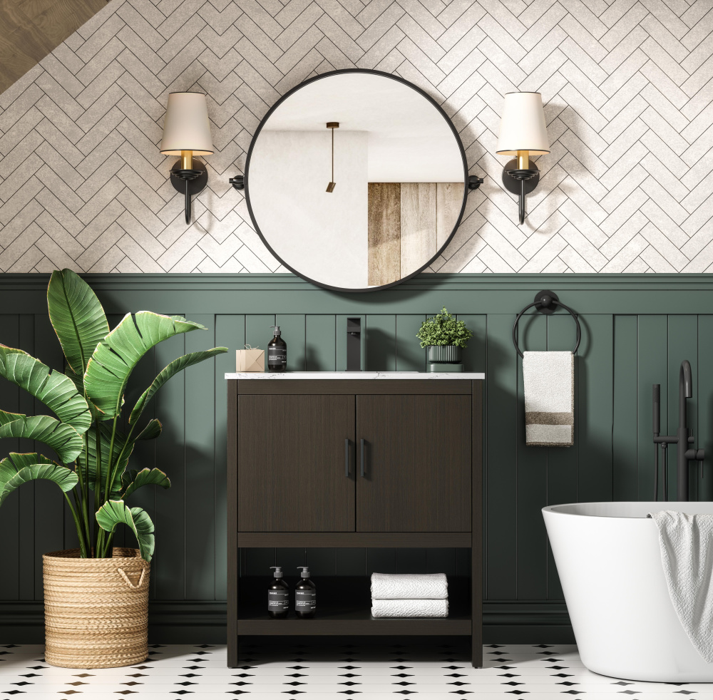 A natural wood-inspired finish adds warmth and texture to your bathroom.