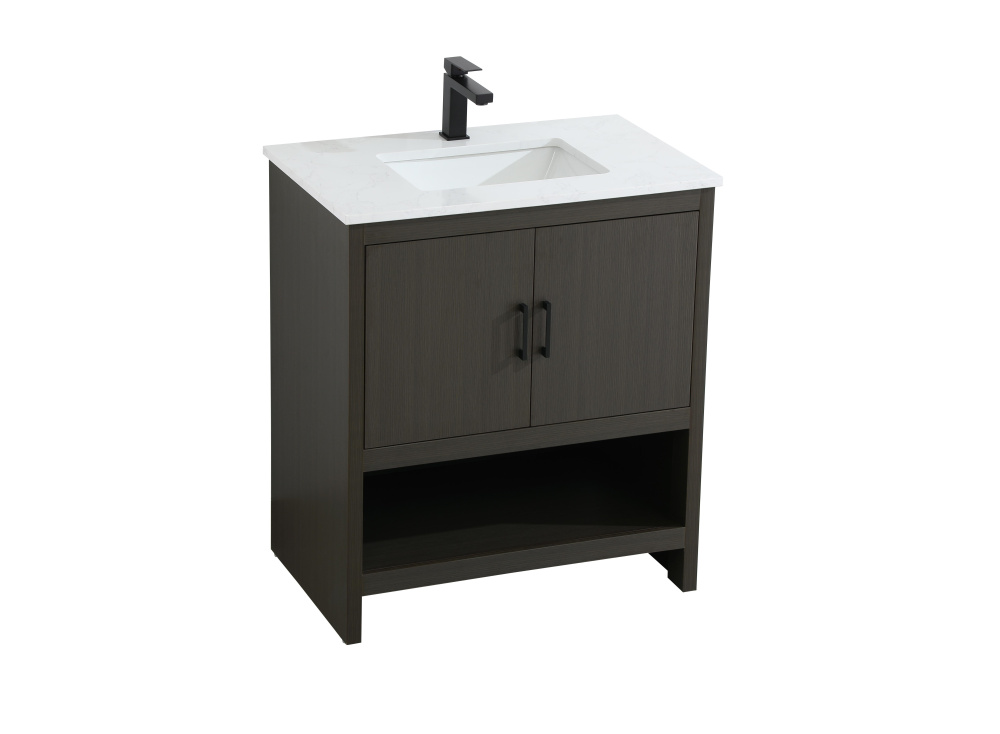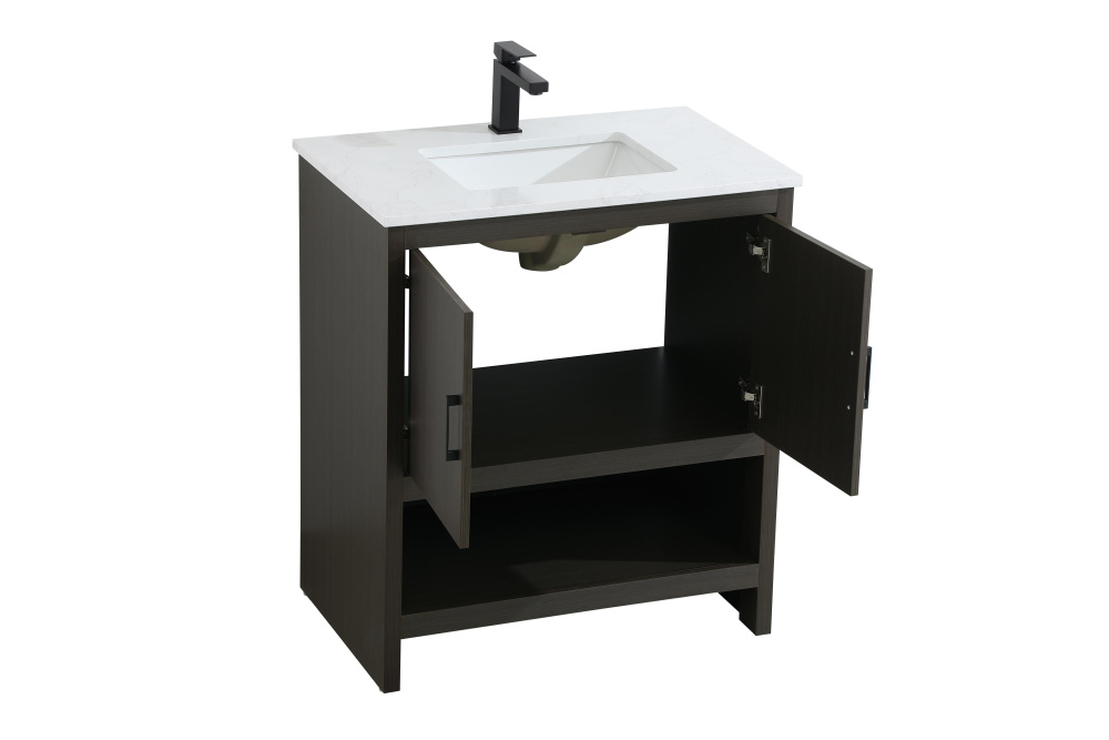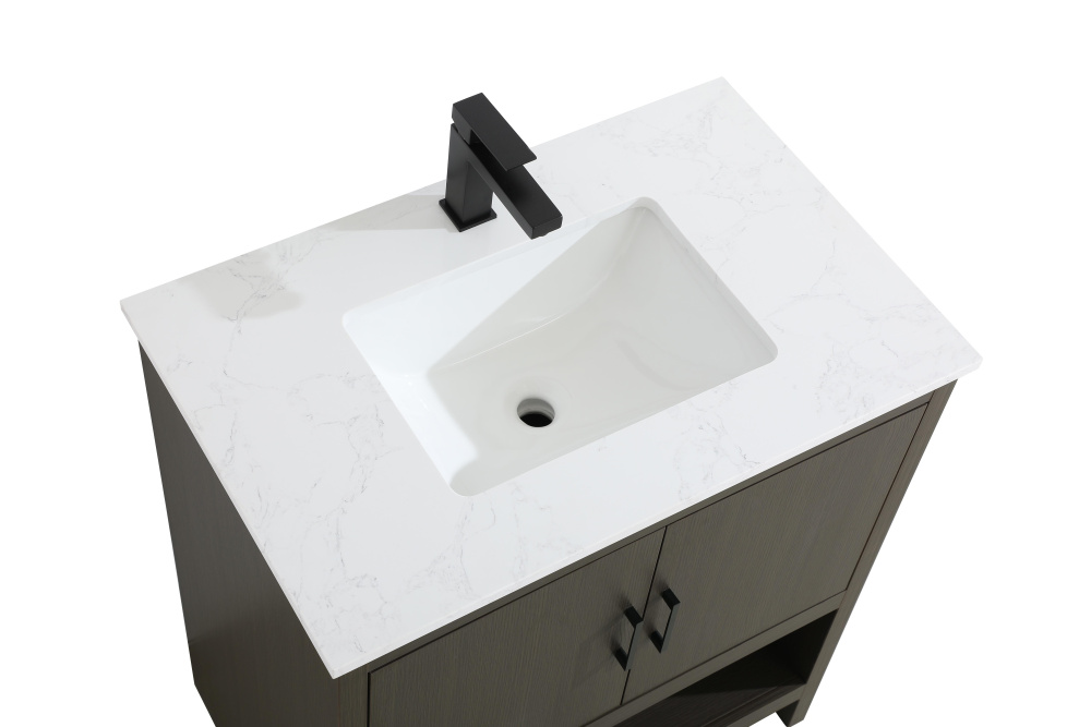 Bring modern style and practicality to your bathroom with this sleek vanity, designed to complement contemporary spaces. The flat-panel doors create a clean, minimalist look, while the open bottom shelf provides functional storage or a space to display decorative items. The engineered marble countertop showcases unique faux marbling, adding a refined and distinct touch to the design. The durable porcelain sink is easy to maintain, and the single pre-drilled faucet hole simplifies the installation process. Constructed from high-quality MDF with a versatile woodgrain finish, this vanity combines durability with timeless style. With adjustable foot levelers for stability on uneven floors and a fully assembled design, this piece offers a seamless addition to your bathroom.