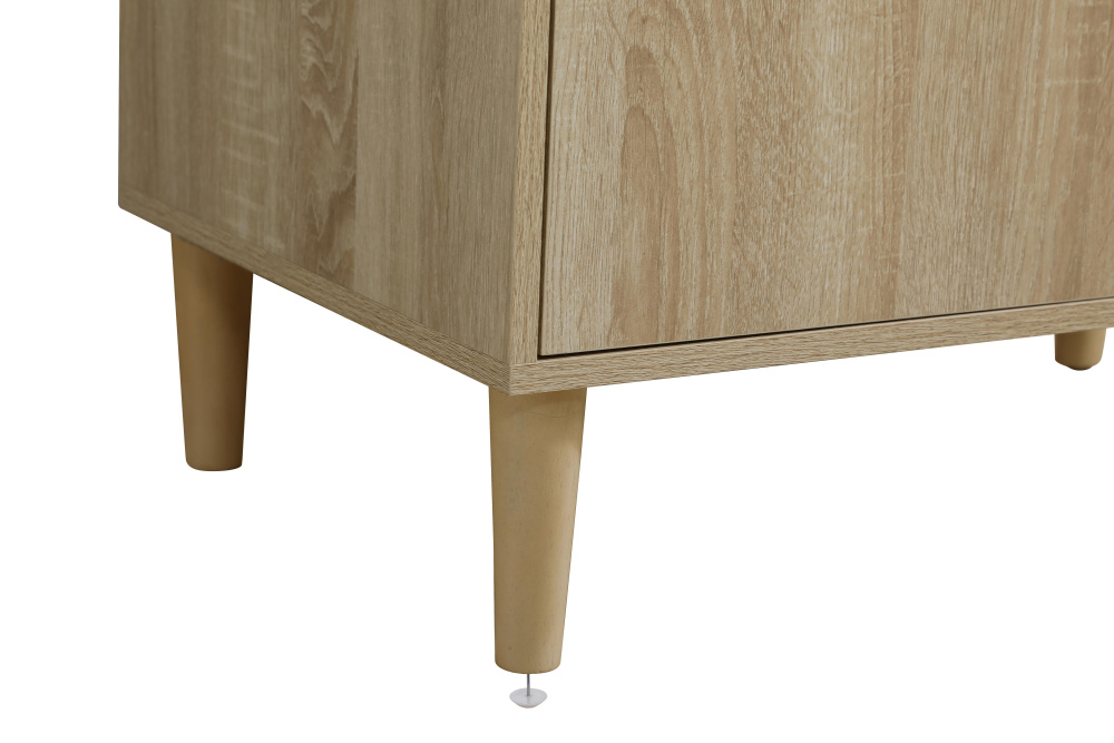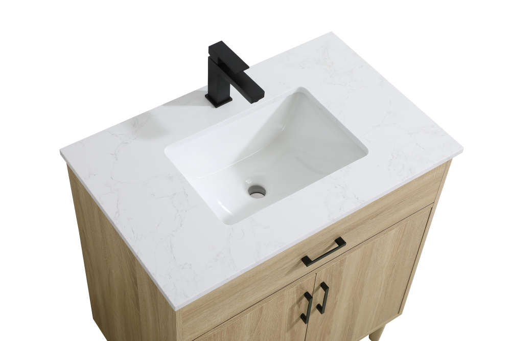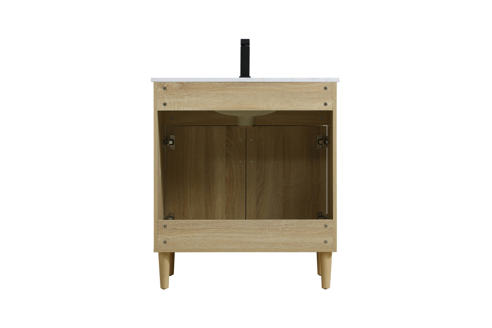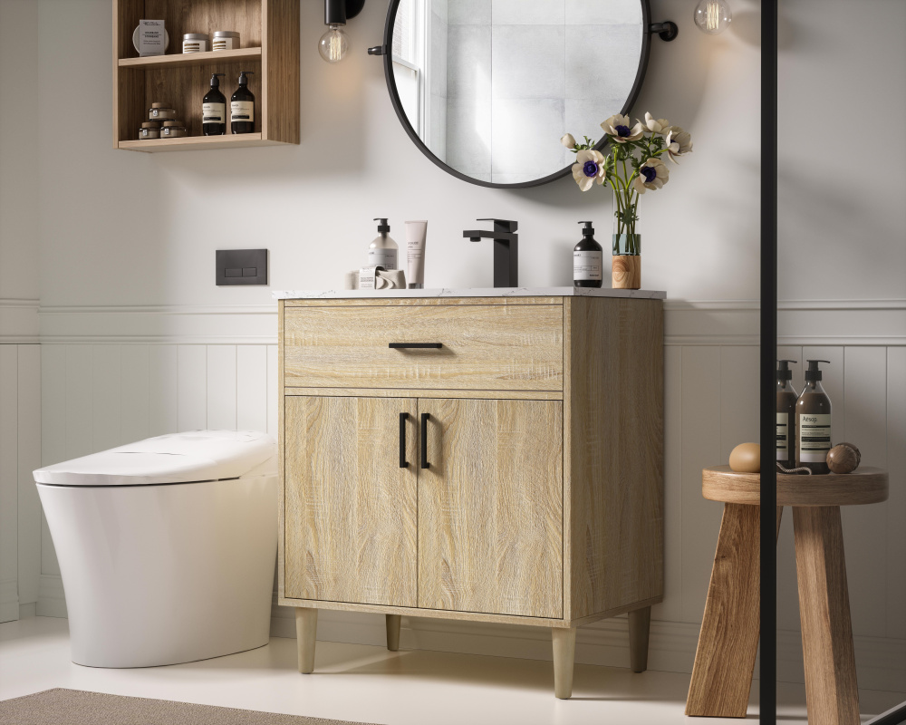 Transform your bathroom with this mid-century modern vanity, designed to bring both functionality and a sense of style to your space. Its clean lines, minimalist design, and tapered solid wood legs evoke a timeless charm, perfect for blending with modern and transitional interiors. The engineered marble countertop, with its unique faux marble veining, adds a refined, luxurious touch, while the porcelain sink is both durable and easy to maintain. Practicality meets aesthetics with a faux drawer for balanced design and a spacious double-door cabinet for efficient storage. Constructed from solid wood and MDF, this vanity offers lasting durability, while adjustable foot levelers ensure stability on any floor. Shipped mostly assembled, the solid wood legs can be effortlessly twisted into place, making installation quick and hassle-free.