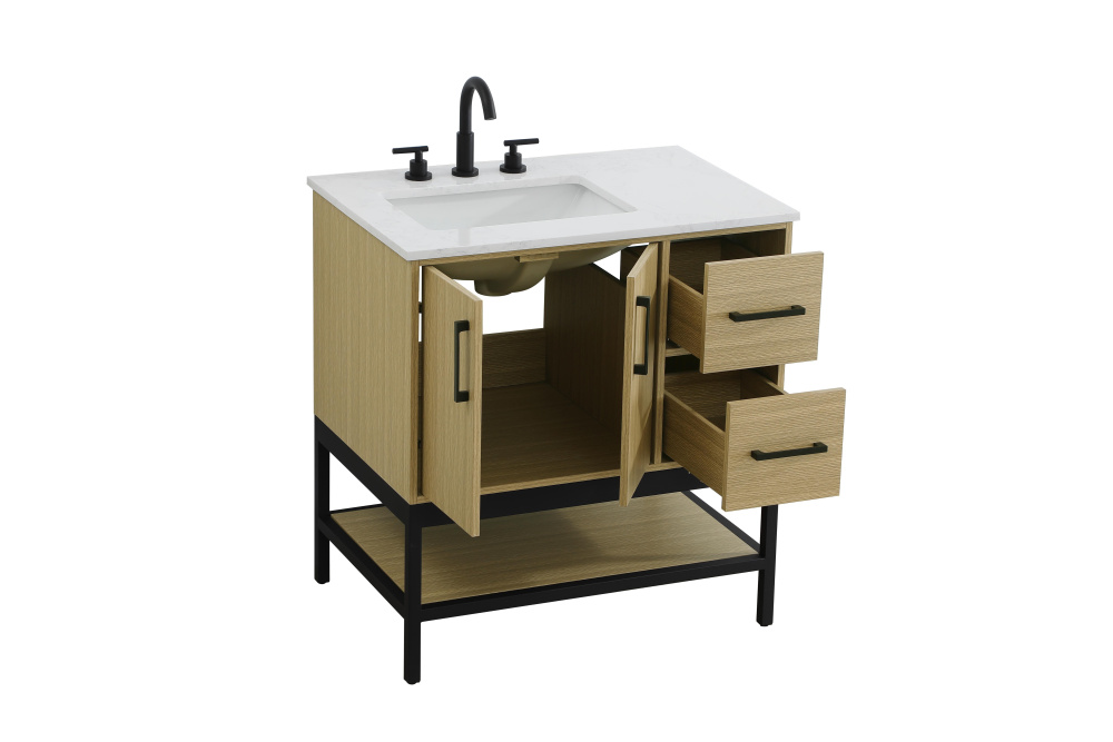 Upgrade your bathroom with this modern bathroom vanity that combines form and function effortlessly. Its sleek wood veneer cabinetry, paired with a bold black metal frame, brings a clean, contemporary vibe to any space. Designed with practicality in mind, the cabinet organizes your essentials, as well as an open lower shelf for added storage or display. The durable engineered marble countertop is built to withstand daily use, while the undermount porcelain sink ensures easy maintenance. Complete with matte black hardware and pre-drilled features for effortless installation, this vanity is the perfect centerpiece to refresh your bathroom with style and efficiency.