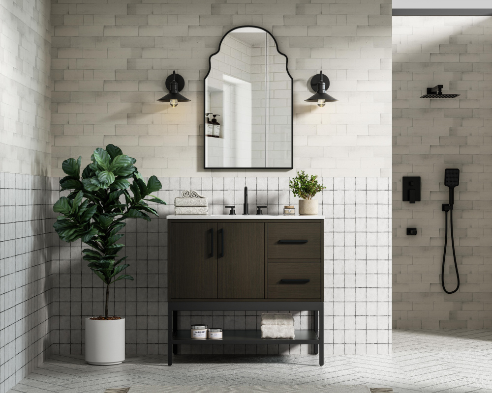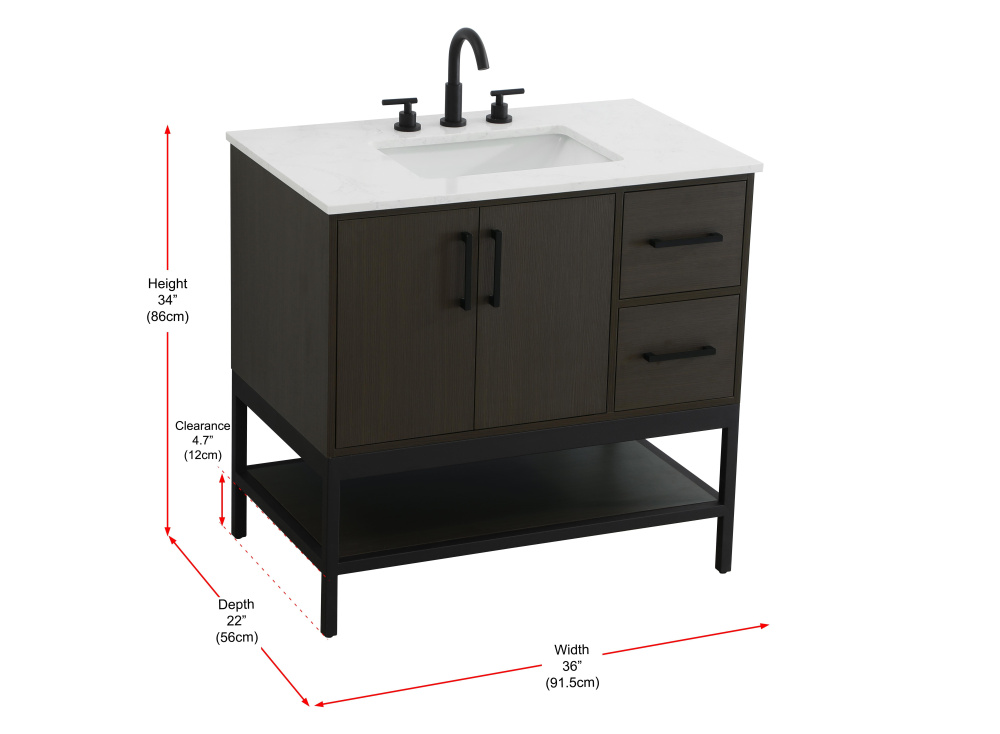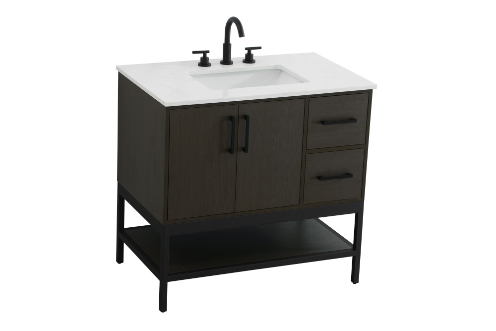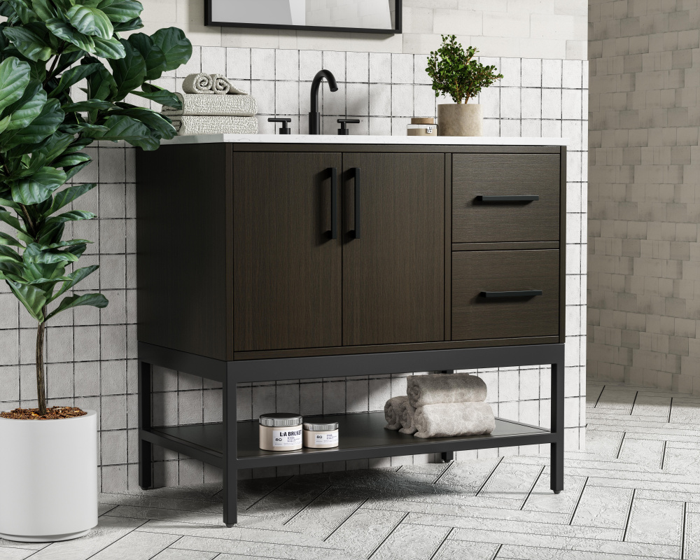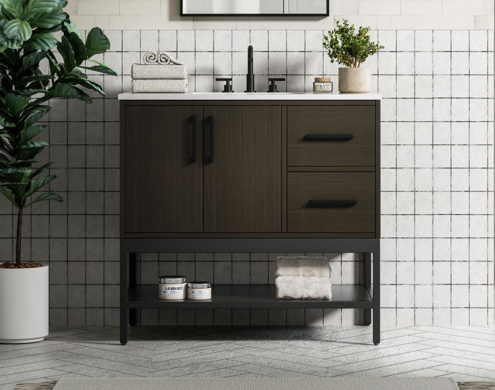 Upgrade your bathroom with this modern bathroom vanity that combines form and function effortlessly. Its sleek wood veneer cabinetry, paired with a bold black metal frame, brings a clean, contemporary vibe to any space. Designed with practicality in mind, this vanity offers soft-close drawers and cabinets to organize your essentials, as well as an open lower shelf for added storage or display. The durable white quartz countertop is built to withstand daily use, while the undermount ceramic sink ensures easy maintenance. Complete with matte black hardware and pre-drilled features for effortless installation, this vanity is the perfect centerpiece to refresh your bathroom with style and efficiency.