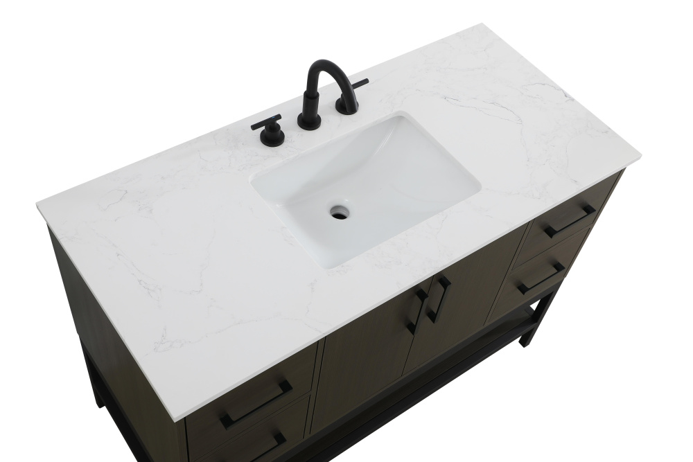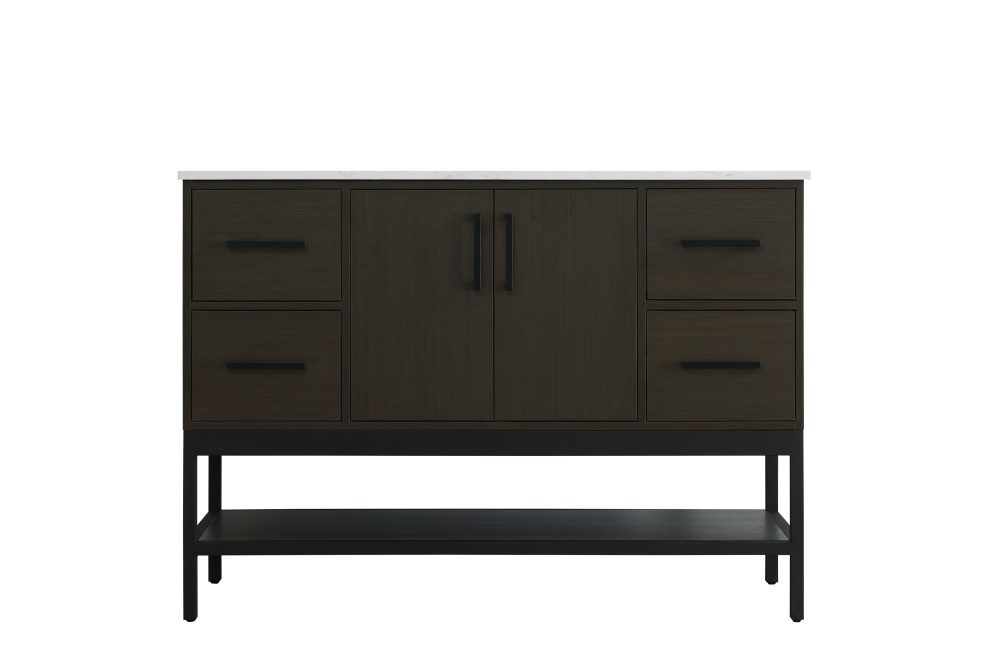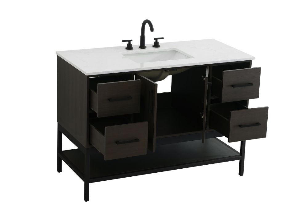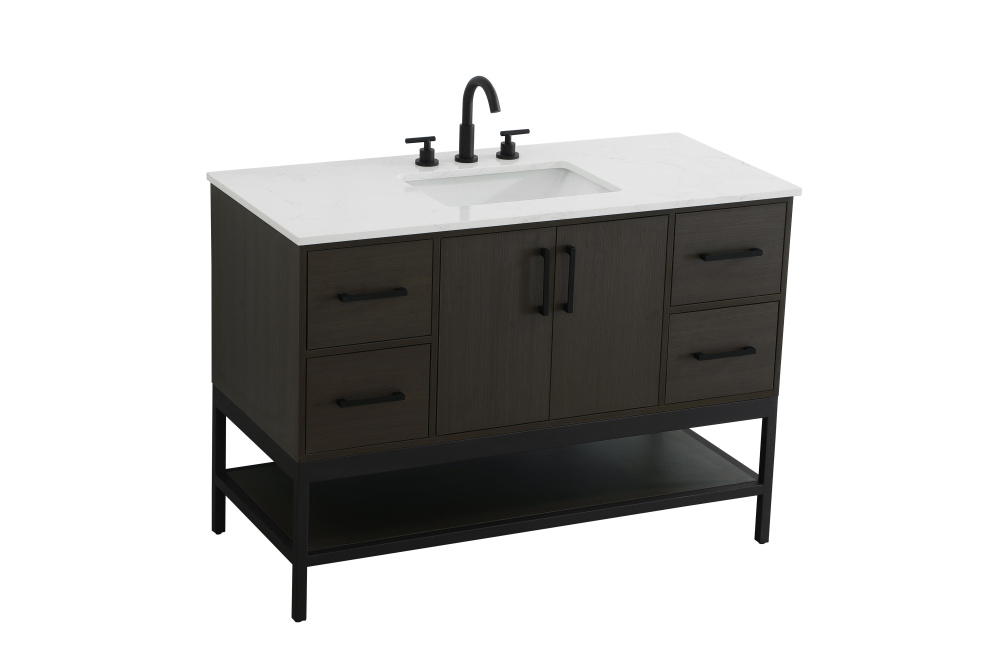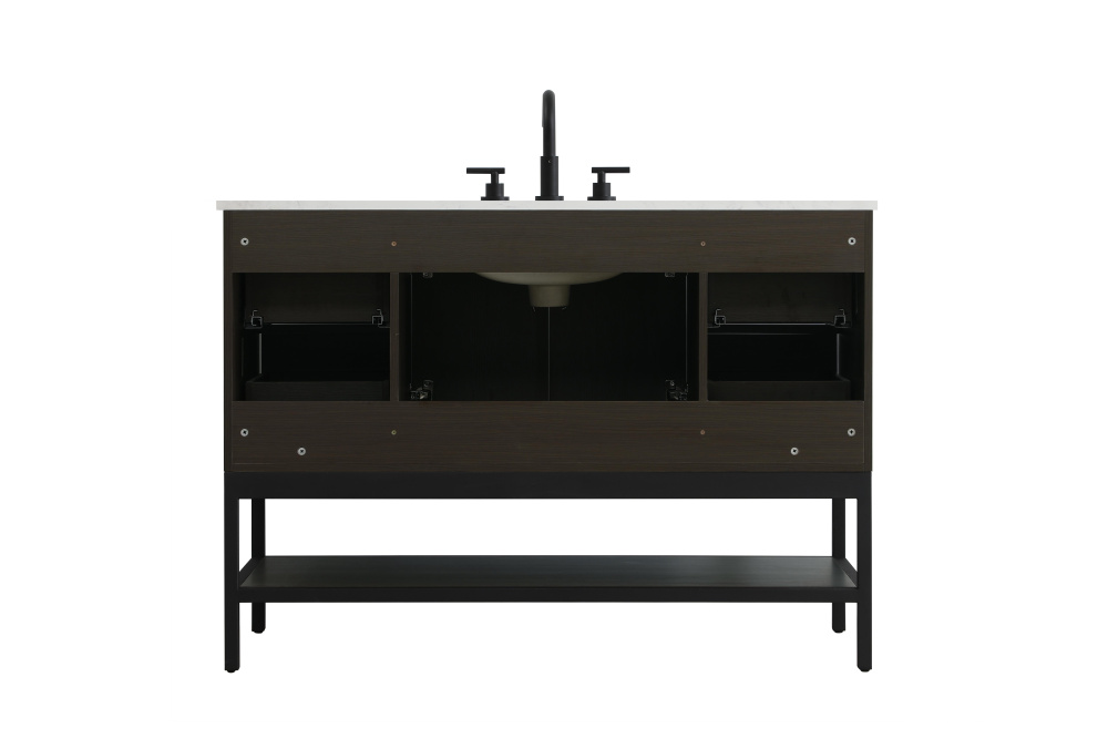 Upgrade your bathroom with this modern bathroom vanity that combines form and function effortlessly. Its sleek wood veneer cabinetry, paired with a bold black metal frame, brings a clean, contemporary vibe to any space. Designed with practicality in mind, this vanity offers soft-close drawers and cabinets to organize your essentials, as well as an open lower shelf for added storage or display. The durable white quartz countertop is built to withstand daily use, while the undermount ceramic sink ensures easy maintenance. Complete with matte black hardware and pre-drilled features for effortless installation, this vanity is the perfect centerpiece to refresh your bathroom with style and efficiency.