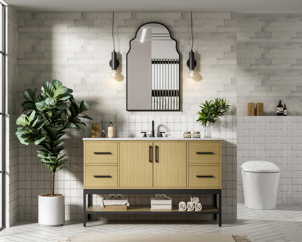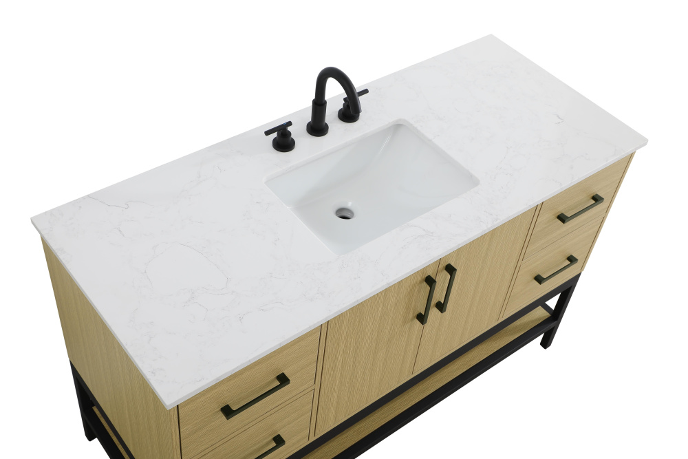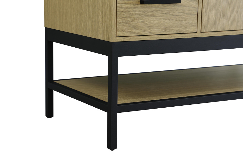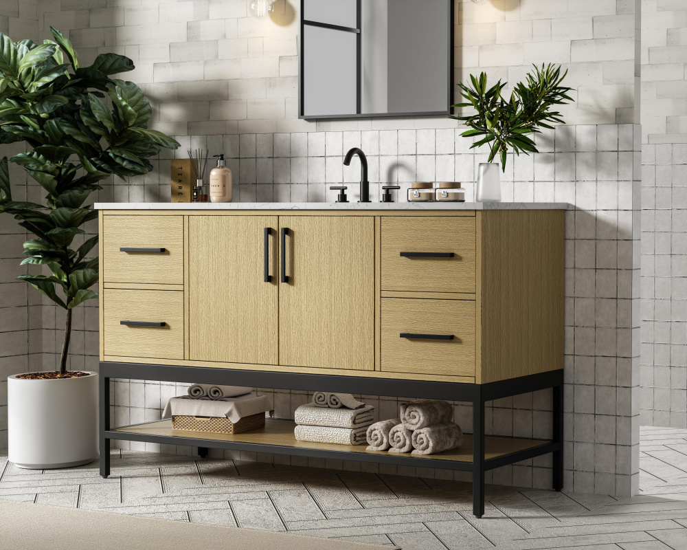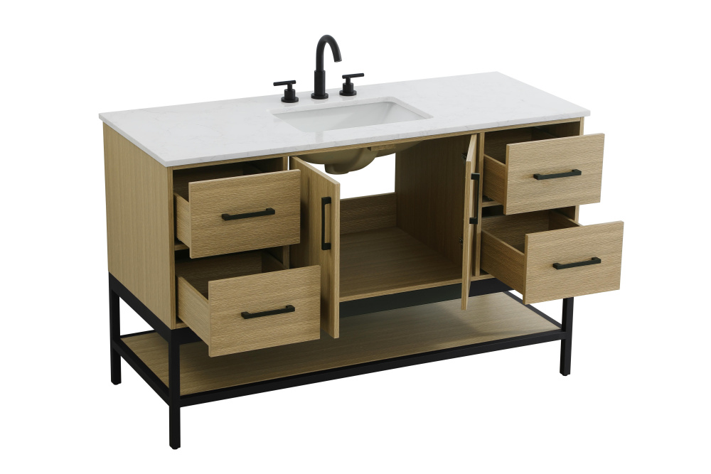 Upgrade your bathroom with this modern bathroom vanity that combines form and function effortlessly. Its sleek wood veneer cabinetry, paired with a bold black metal frame, brings a clean, contemporary vibe to any space. Designed with practicality in mind, this vanity offers soft-close drawers and cabinets to organize your essentials, as well as an open lower shelf for added storage or display. The durable white quartz countertop is built to withstand daily use, while the undermount ceramic sink ensures easy maintenance. Complete with matte black hardware and pre-drilled features for effortless installation, this vanity is the perfect centerpiece to refresh your bathroom with style and efficiency.