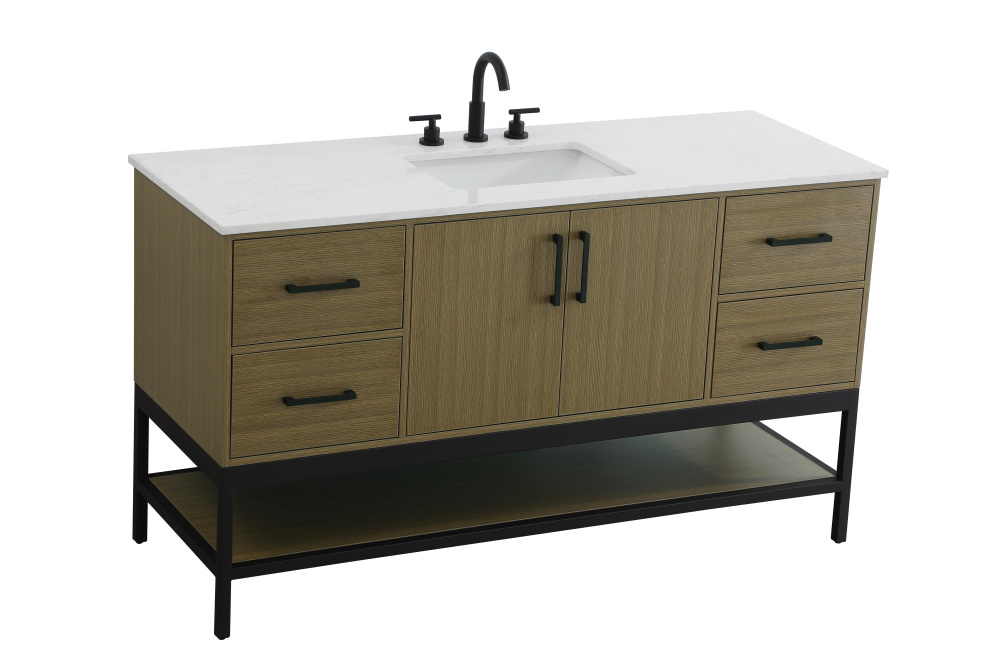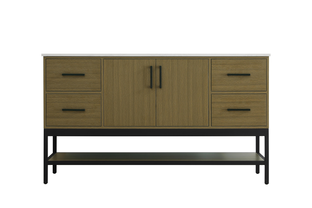 Upgrade your bathroom with this modern bathroom vanity that combines form and function effortlessly. Its sleek wood veneer cabinetry, paired with a bold black metal frame, brings a clean, contemporary vibe to any space. Designed with practicality in mind, this vanity offers soft-close drawers and cabinets to organize your essentials, as well as an open lower shelf for added storage or display. The durable white quartz countertop is built to withstand daily use, while the undermount ceramic sink ensures easy maintenance. Complete with matte black hardware and pre-drilled features for effortless installation, this vanity is the perfect centerpiece to refresh your bathroom with style and efficiency.