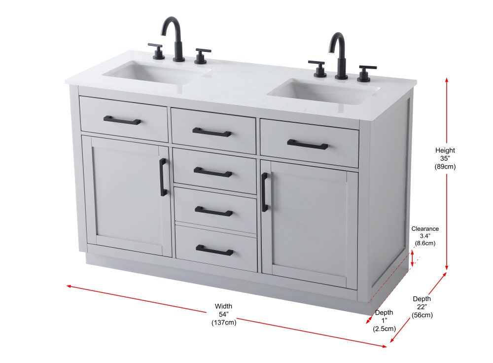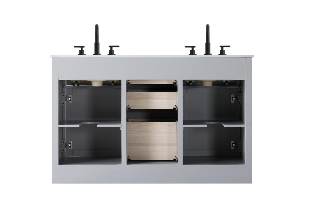Introduce a perfect balance of functionality and style to your bathroom with this thoughtfully designed vanity. Constructed with a combination of solid wood and MDF, it offers durability and a sturdy build. The sleek engineered marble countertop with subtle grey marbling complements the rustic wood grain finish, creating a stylish and inviting centerpiece for your bathroom. Designed in a contemporary style with a transitional flair, it features a U-shaped shelf for seamless plumbing integration and multiple soft-close drawers for clutter-free organization. A pull-down drawer enhances convenience, while the toe kick adds a refined, clean-lined appearance and simplifies cleaning underneath. Matte black hardware contrasts beautifully with the cabinet finish, tying the look together. Delivered fully assembled and equipped with foot levelers, this vanity combines practicality and aesthetic appeal to suit modern and transitional bathrooms alike.