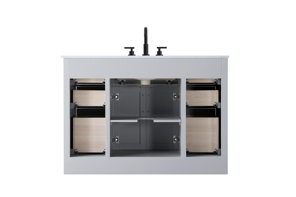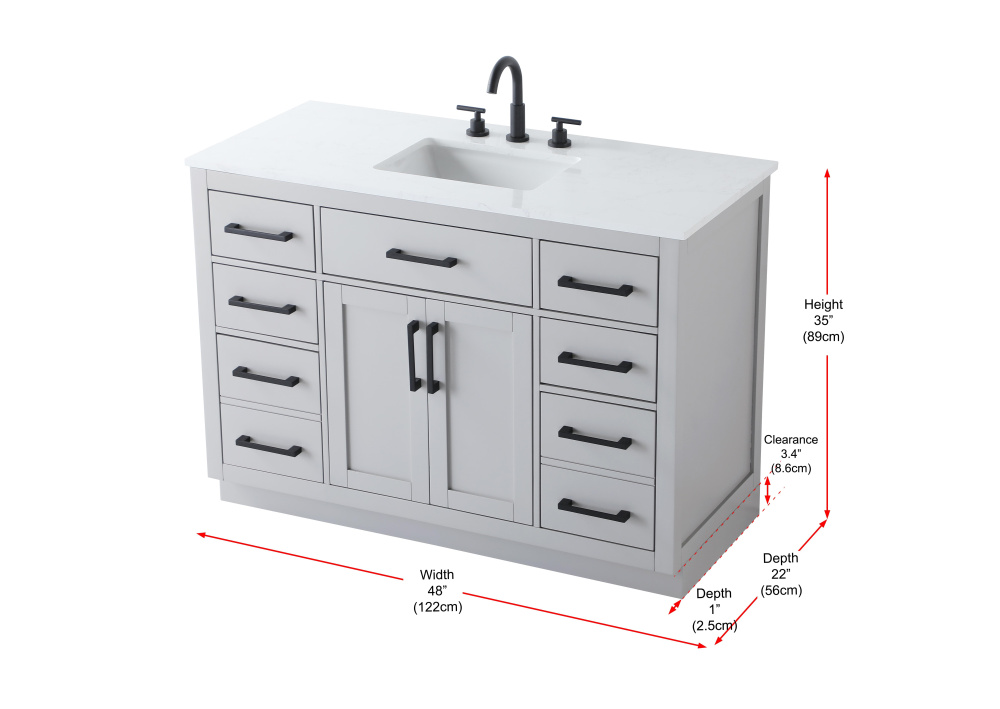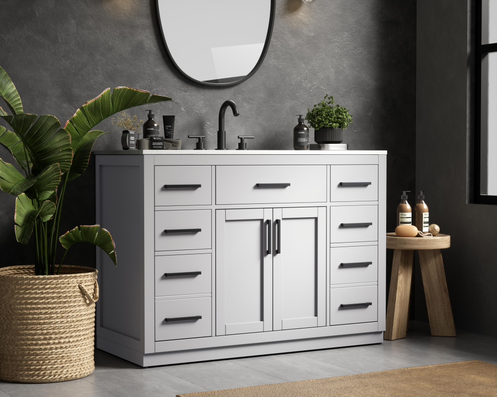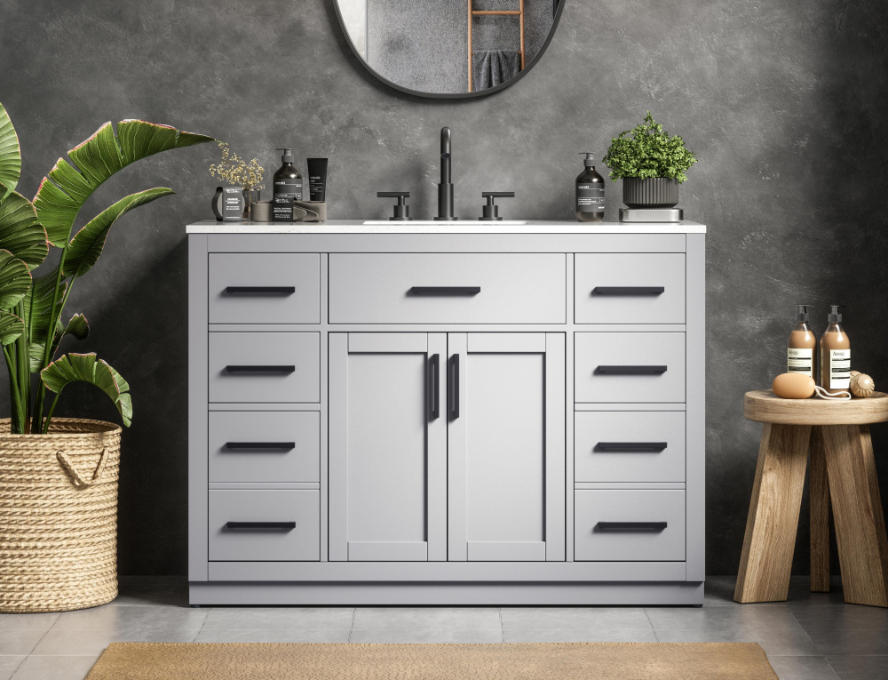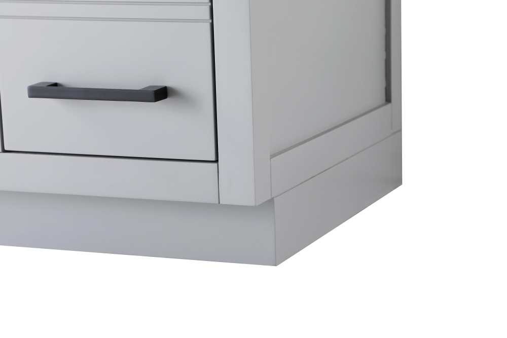 Spacious bottom deep drawers provide extra room for storing larger items like towels or cleaning supplies.