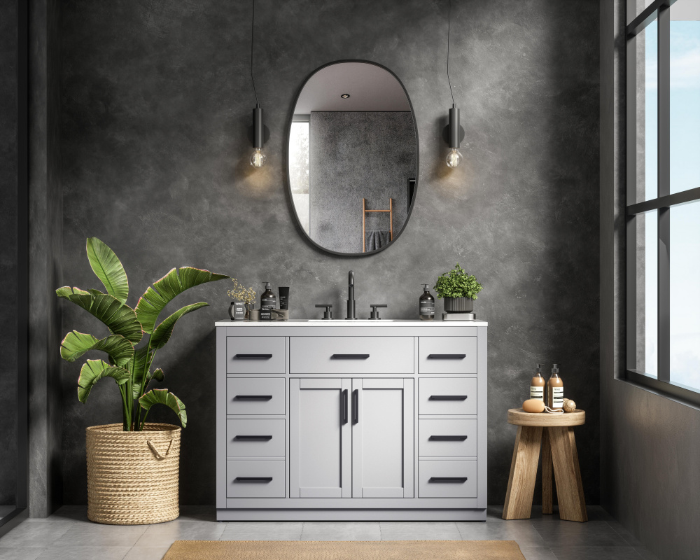 Toe kick design offers a streamlined look while providing easy cleaning access beneath the vanity.