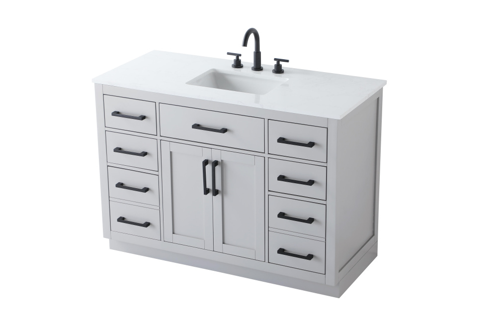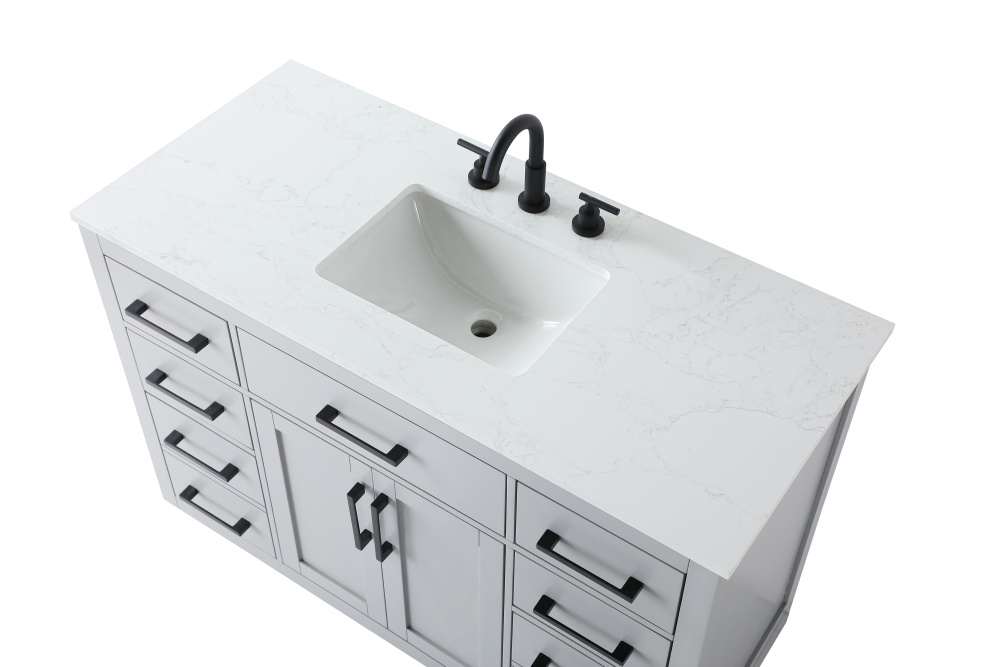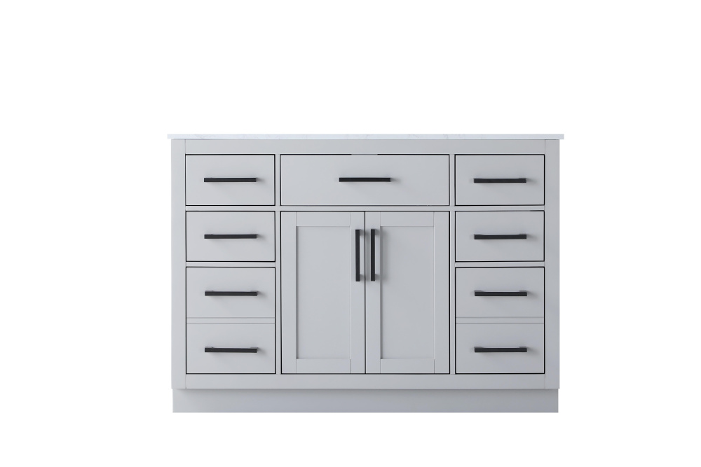Introduce a perfect balance of functionality and style to your bathroom with this thoughtfully designed vanity. Constructed with a combination of solid wood and MDF, it offers durability and a sturdy build. The sleek engineered marble countertop with subtle grey marbling complements the rustic wood grain finish, creating a stylish and inviting centerpiece for your bathroom. Designed in a contemporary style with a transitional flair, it features a U-shaped shelf for seamless plumbing integration and multiple soft-close drawers for clutter-free organization. A pull-down drawer enhances convenience, while the toe kick adds a refined, clean-lined appearance and simplifies cleaning underneath. Matte black hardware contrasts beautifully with the cabinet finish, tying the look together. Delivered fully assembled and equipped with foot levelers, this vanity combines practicality and aesthetic appeal to suit modern and transitional bathrooms alike.
