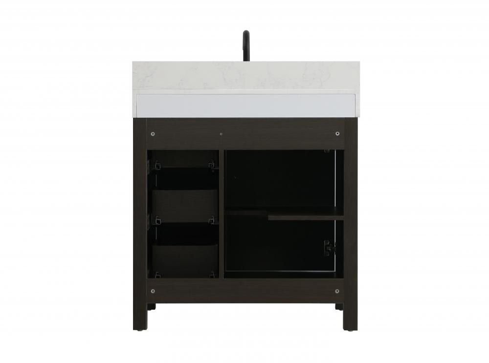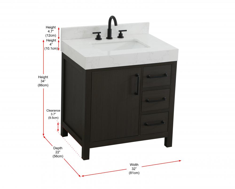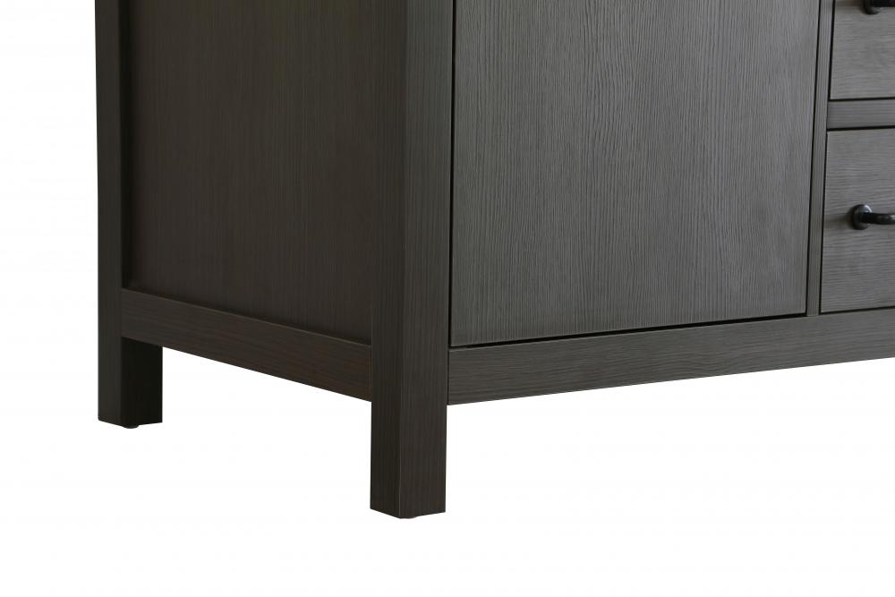This bathroom vanity embodies a sleek, modern design with a strong, minimalist appeal. The deep mocha brown finish enhances the bold and sophisticated appearance, while the flat-panel doors and drawer fronts contribute to its clean, structured aesthetic. The wood's dark tone adds depth and richness, making it a striking focal point in any bathroom setting. The sturdy rectangular frame, combined with the thick engineered marble countertop, makes a bold and harmonious statement, providing an understated luxury without being overly ornate. Elevate your bathroom functionality with this thoughtfully designed bathroom vanity cabinet. The standout feature is the engineered marble countertop, boasting a bold 4-inch thickness and natural veining for a striking visual appeal. The vanity features a functional layout, with two cabinet doors on one side and three stacked drawers on the other, creating a balanced and organized look. Matte black hardware, including slim and cylindrical pulls, contrasts elegantly against the dark wood, reinforcing its contemporary vibe while providing subtle visual interest. This vanity is perfect for those seeking a design that combines modern simplicity with a touch of bold refinement. This vanity is delivered fully assembled and equipped with foot levelers for effortless installation and stability. Combining practicality and bold design, this vanity is UPC certified and ready to transform your bathroom space. The matching backsplash seamlessly integrates with the countertop, offering a cohesive design that protects walls from splashes while maintaining a unified look.