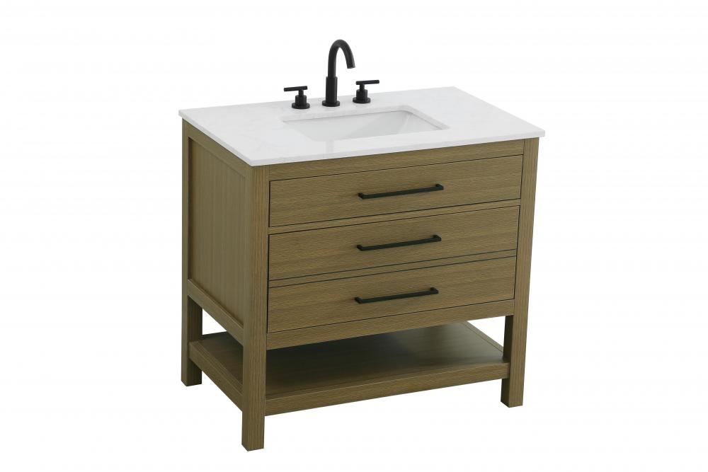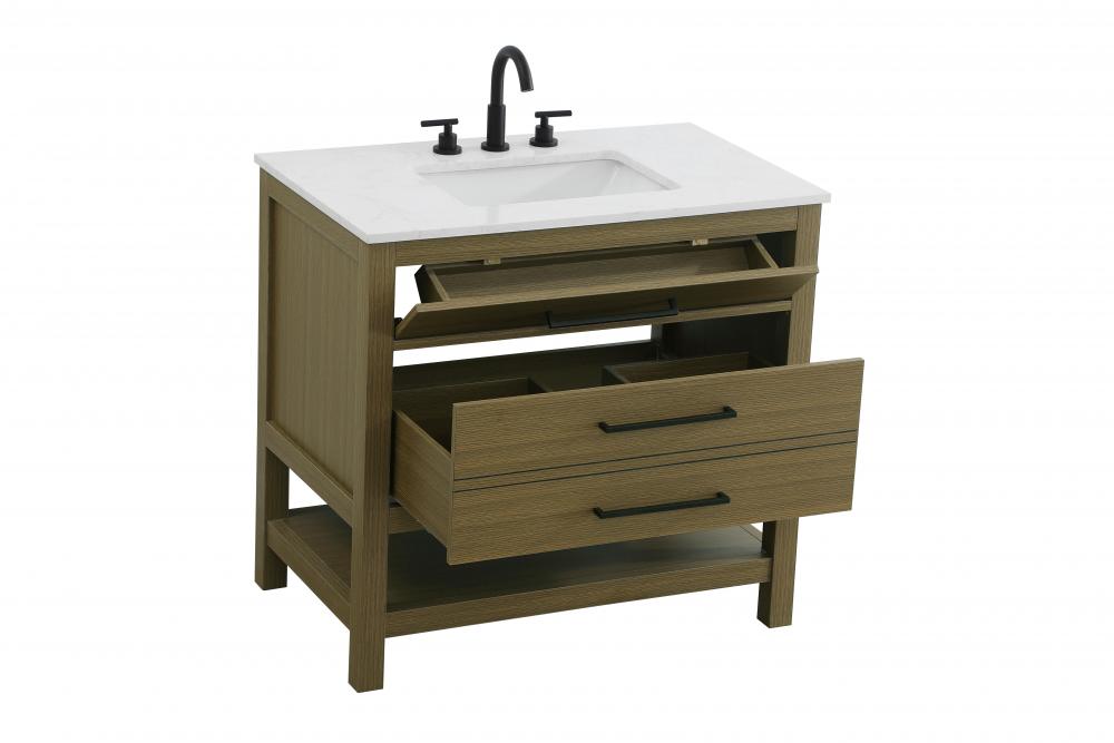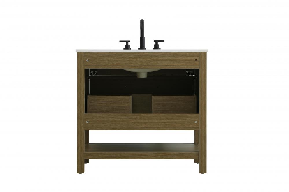 Elevate your bathroom design with this versatile and beautifully crafted bathroom vanity cabinet. The engineered marble top features striking veining, adding a luxurious focal point to your space. Built from premium solid wood and MDF, it ensures long-lasting durability and strength. The porcelain sink, complete with a concealed overflow, offers a seamless and refined finish.Available in four stunning finishes—Chestnut Brown, Honey Brown, Mocha Brown, and White—this vanity suits any interior style. Designed with convenience in mind, it features soft-closing drawers with modern handles and a tip-out drawer for easy access to small essentials, keeping your space tidy. The bottom deep drawer mimics the appearance of two separate drawers, providing ample storage for larger items, while the open shelf at the base offers additional storage space for towels or decor.Fully assembled for your convenience, it includes foot levelers for stability on any surface. For a complete look, pair it with an optional matching backsplash, sold separately. UPC certified for quality assurance, this vanity is the perfect combination of functionality, style, and ease of use.