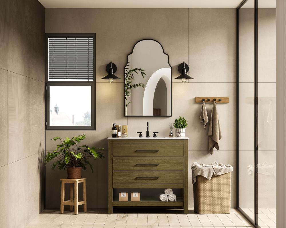 A functional tip-out drawer provides quick access to small items like toiletries, keeping your countertop clutter-free.