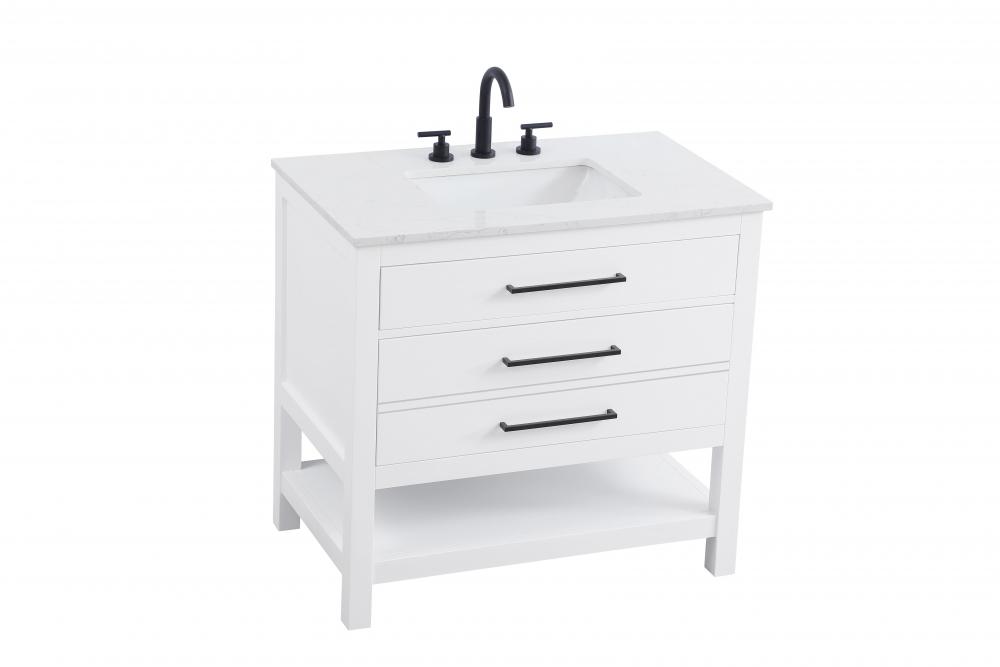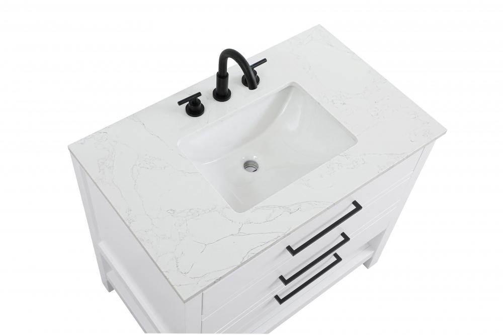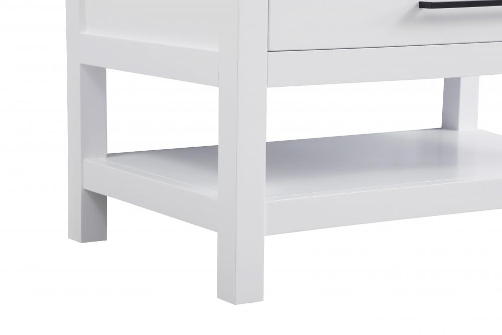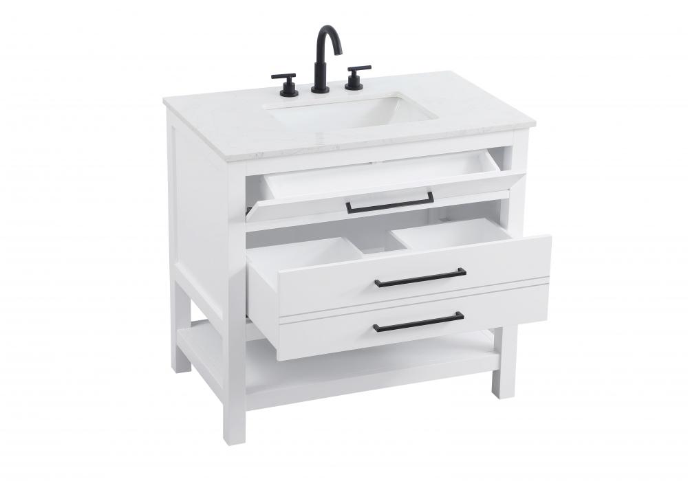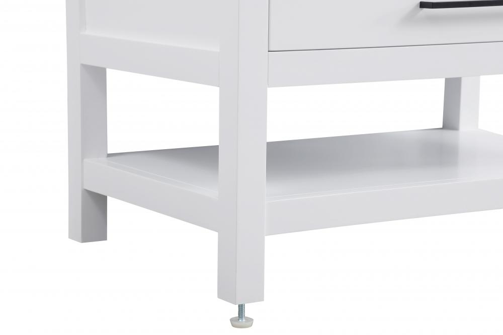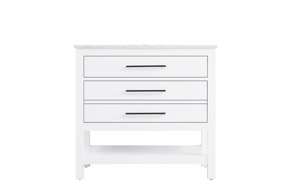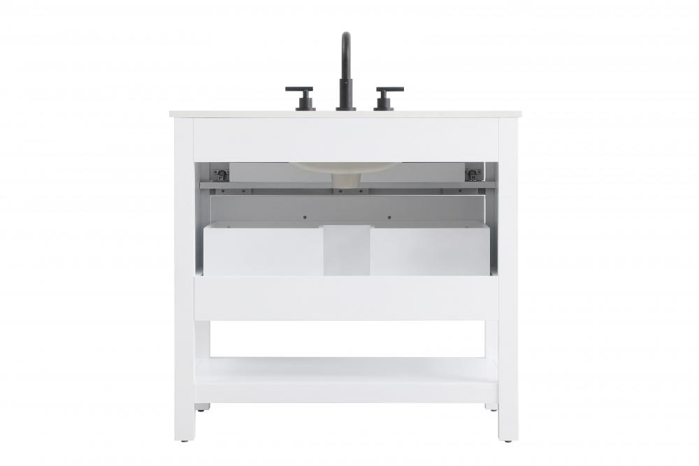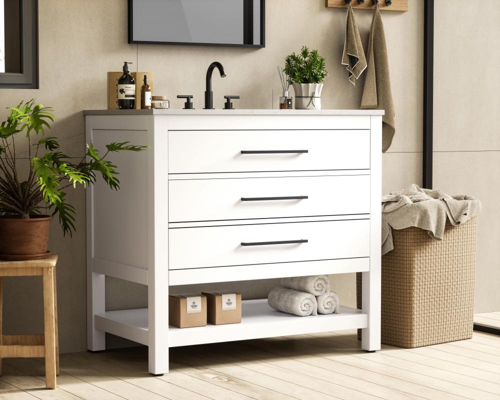 Elevate your bathroom design with this versatile and beautifully crafted bathroom vanity cabinet. The engineered marble top features striking veining, adding a luxurious focal point to your space. Built from premium solid wood and MDF, it ensures long-lasting durability and strength. The porcelain sink, complete with a concealed overflow, offers a seamless and refined finish.Available in four stunning finishes—Chestnut Brown, Honey Brown, Mocha Brown, and White—this vanity suits any interior style. Designed with convenience in mind, it features soft-closing drawers with modern handles and a tip-out drawer for easy access to small essentials, keeping your space tidy. The bottom deep drawer mimics the appearance of two separate drawers, providing ample storage for larger items, while the open shelf at the base offers additional storage space for towels or decor.Fully assembled for your convenience, it includes foot levelers for stability on any surface. For a complete look, pair it with an optional matching backsplash, sold separately. UPC certified for quality assurance, this vanity is the perfect combination of functionality, style, and ease of use.