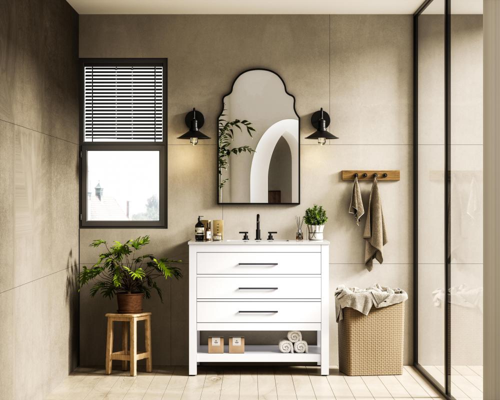 A functional tip-out drawer provides quick access to small items like toiletries, keeping your countertop clutter-free.