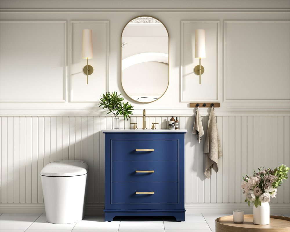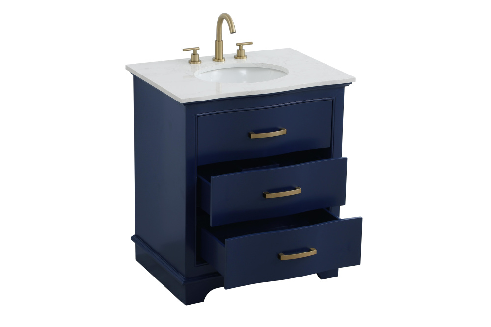 Enhance your bathroom with this expertly crafted vanity that combines functionality and timeless design. The slightly curved silhouette adds softness and sophistication, while the faux-marble countertop showcases unique veining for a one-of-a-kind look. Complete with a porcelain undermount sink, this vanity is available in White, Blue, and Grey finishes to complement any décor. Soft-closing drawers offer quiet and smooth storage access, including a U-shaped middle drawer designed to fit around plumbing. Built with solid wood and MDF for lasting durability, it also features adjustable foot levelers for stability and ships fully assembled, making it an effortless and stylish upgrade to your space.