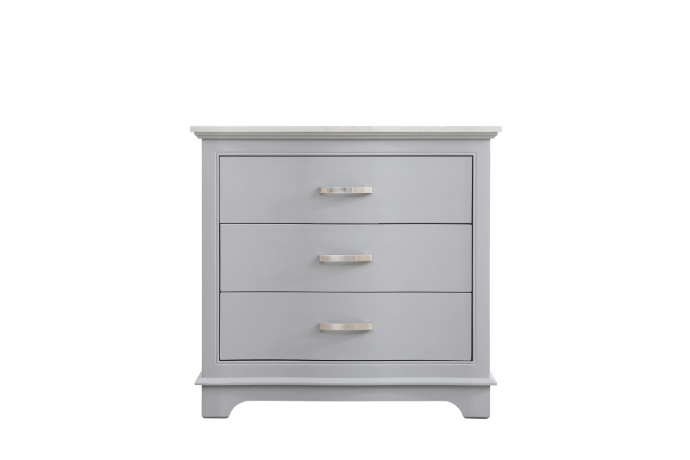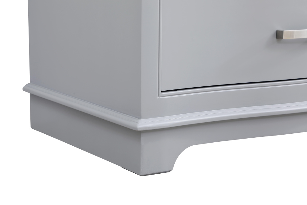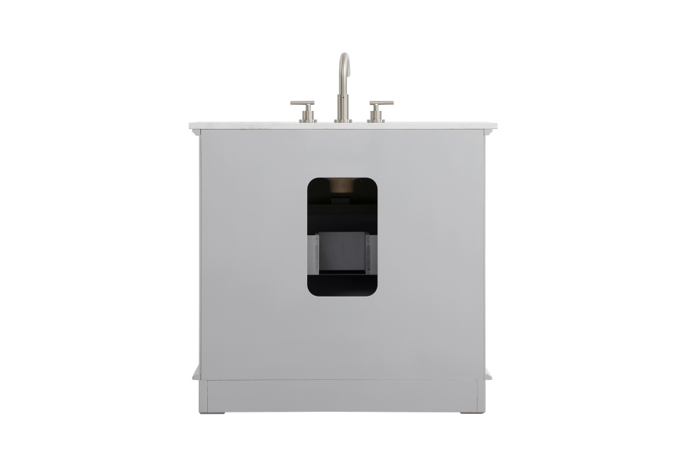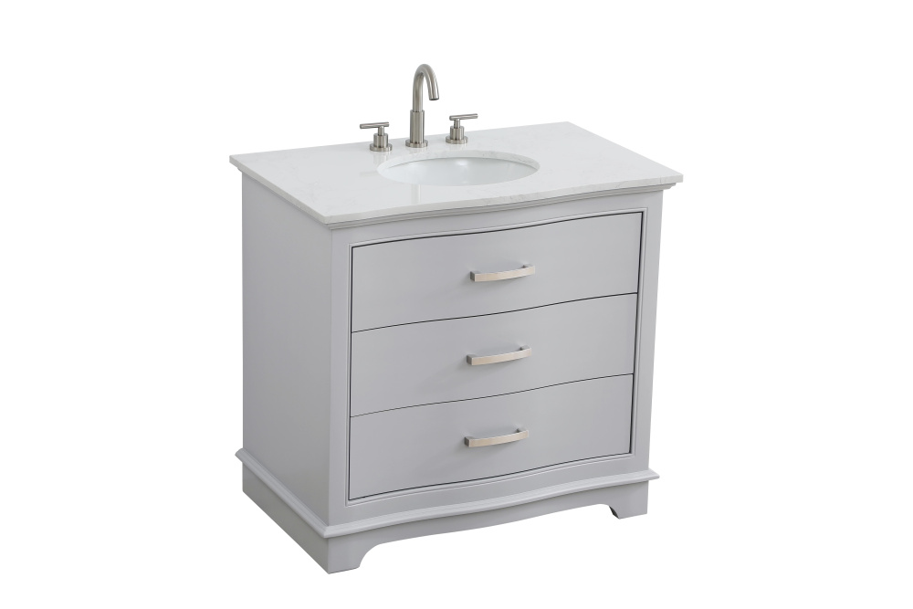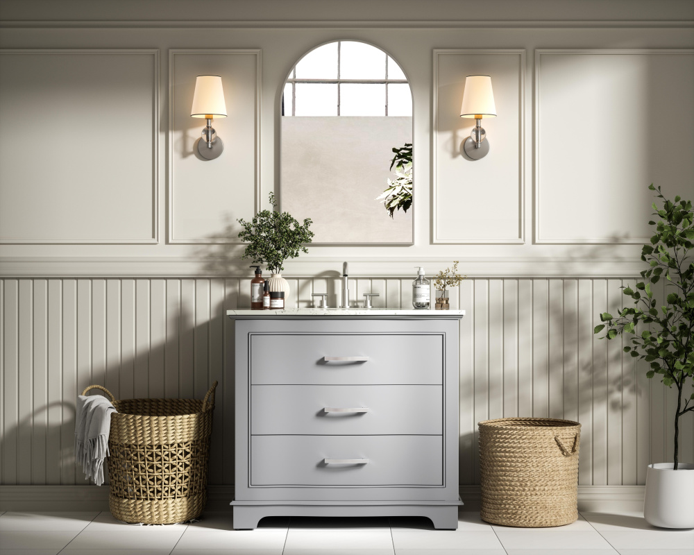 Enhance your bathroom with this expertly crafted vanity that combines functionality and timeless design. The slightly curved silhouette adds softness and sophistication, while the faux-marble countertop showcases unique veining for a one-of-a-kind look. Complete with a porcelain undermount sink, this vanity is available in White, Blue, and Grey finishes to complement any décor. Soft-closing drawers offer quiet and smooth storage access, including a U-shaped middle drawer designed to fit around plumbing. Built with solid wood and MDF for lasting durability, it also features adjustable foot levelers for stability and ships fully assembled, making it an effortless and stylish upgrade to your space.