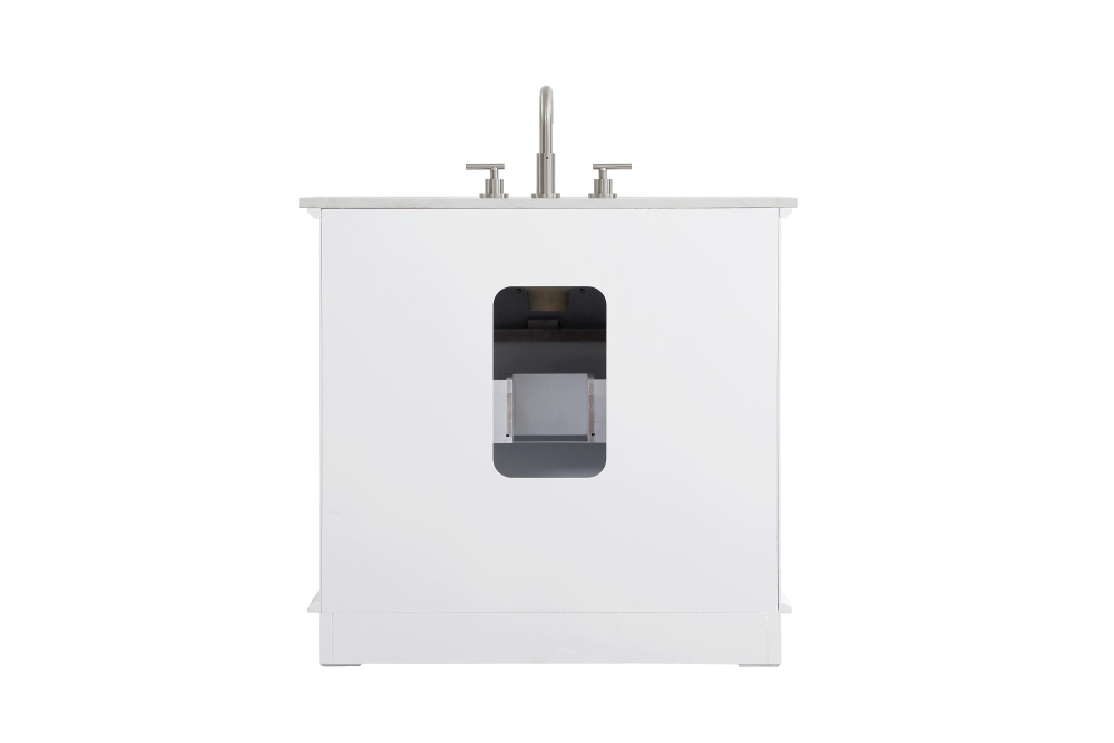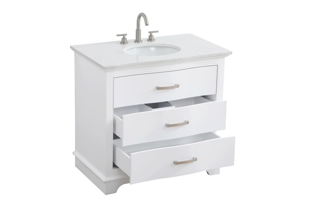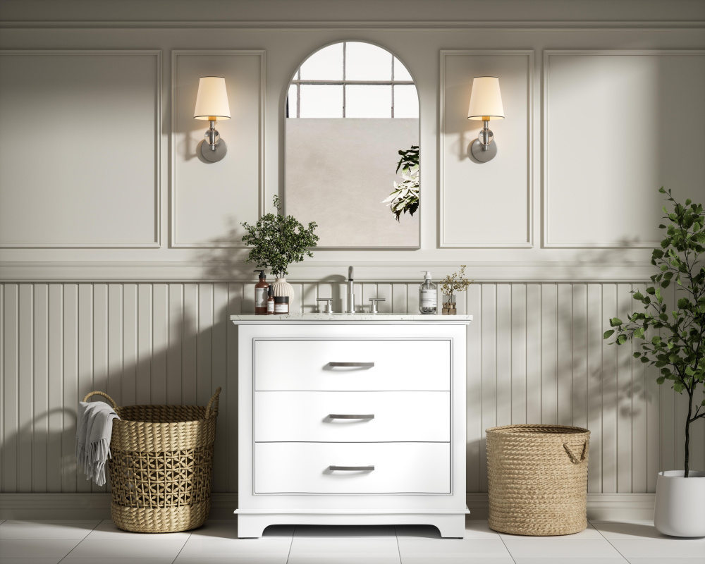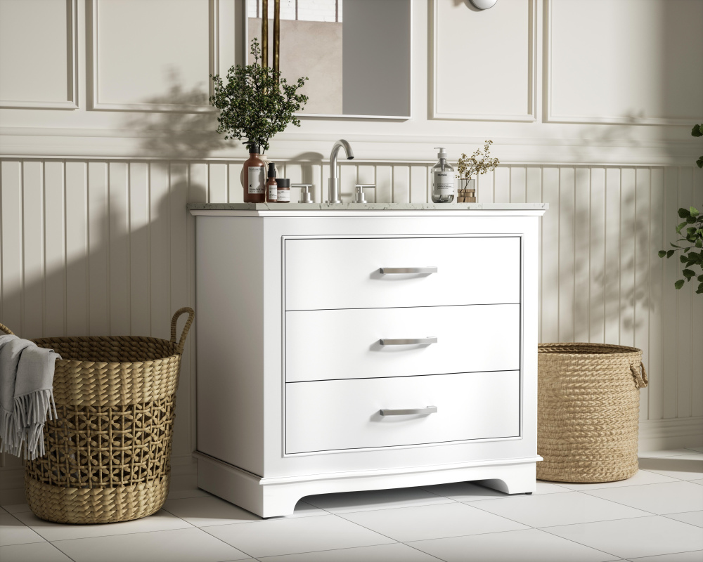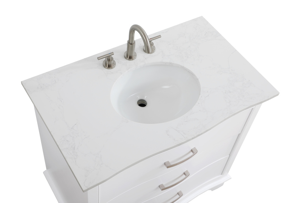 Enhance your bathroom with this expertly crafted vanity that combines functionality and timeless design. The slightly curved silhouette adds softness and sophistication, while the faux-marble countertop showcases unique veining for a one-of-a-kind look. Complete with a porcelain undermount sink, this vanity is available in White, Blue, and Grey finishes to complement any décor. Soft-closing drawers offer quiet and smooth storage access, including a U-shaped middle drawer designed to fit around plumbing. Built with solid wood and MDF for lasting durability, it also features adjustable foot levelers for stability and ships fully assembled, making it an effortless and stylish upgrade to your space.