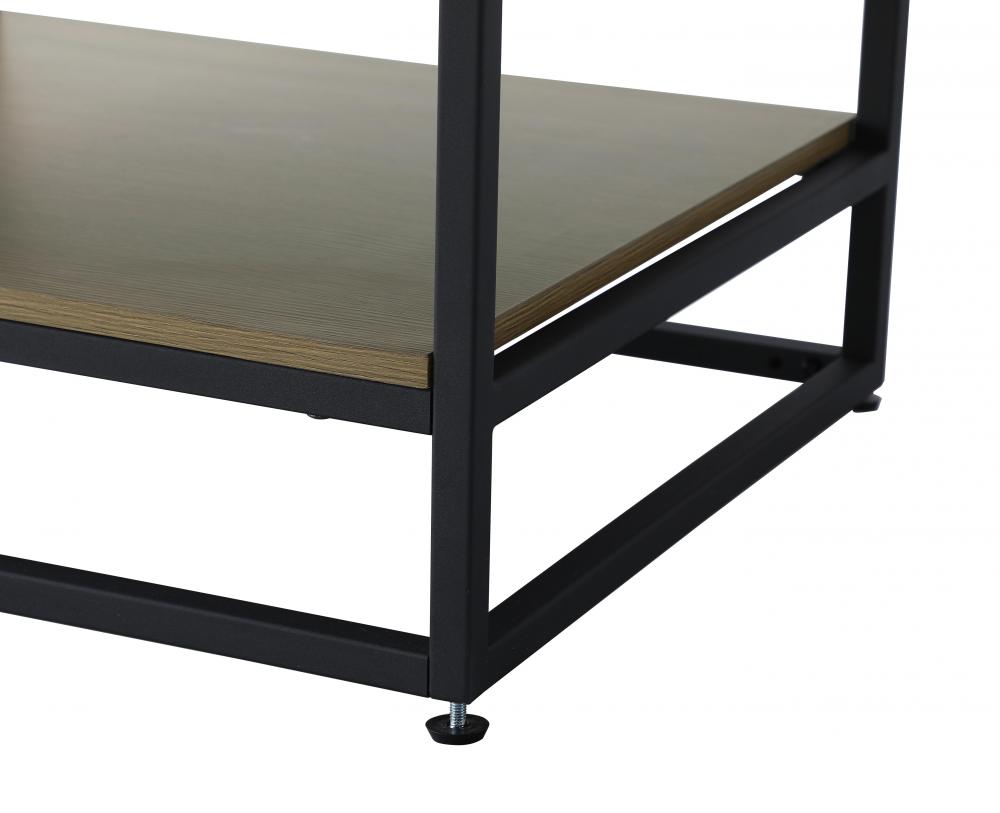 A matching open wood shelf at the bottom provides ample space for storage and decor, supported by slender black metal legs with a 14-inch clearance, combining both practical function and a contemporary edge.
