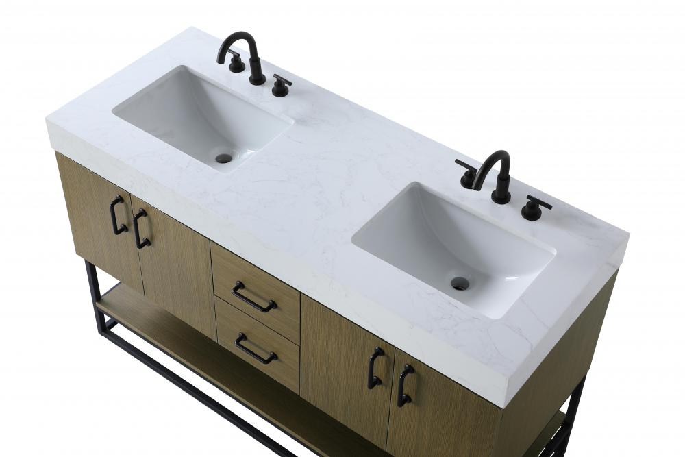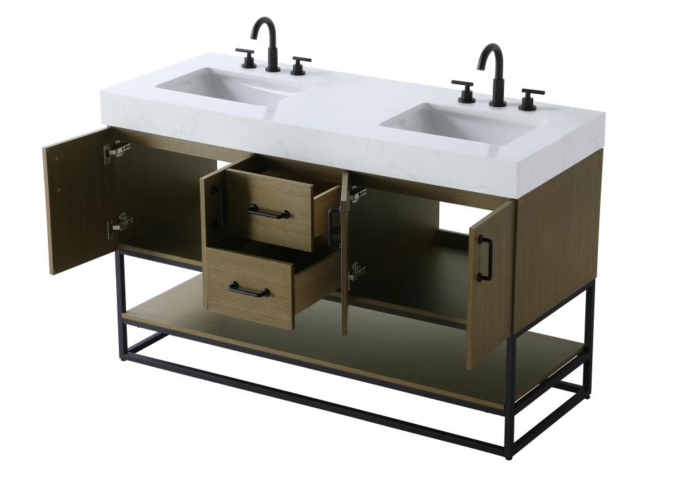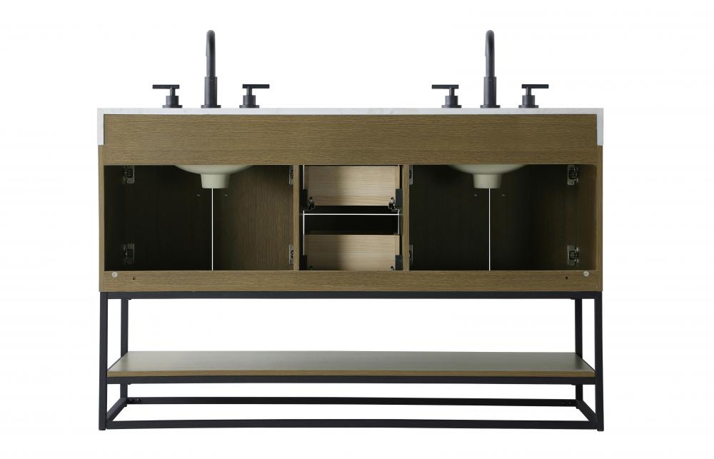 Upgrade your bathroom with this stylish transitional vanity, available in five stunning finishes, from crisp white to warm honey brown, designed to suit a variety of decor styles. The minimalist flat door panels and open wood shelf create a functional yet visually appealing storage solution, while the slender black metal legs elevate the look with modern sophistication. The 4-inch thick white engineered marble countertop, accented with natural veining, adds a luxurious touch, perfectly complemented by soft-closing doors with sleek black metal bar pulls. Thoughtful details like the concealed overflow, back panel cutout for plumbing, and 3 pre-drilled holes for an 8-inch faucet make installation easy and efficient. with a porcelain sink and farmhouse-inspired touches, this vanity brings both elegance and practicality to any bathroom setting.