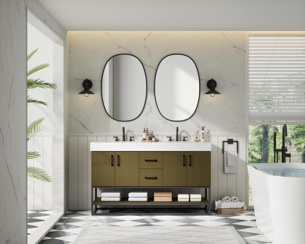 Flat panel designs create a minimalist and modern look, giving the vanity clean lines while maintaining a subtle, farmhouse-inspired charm.
