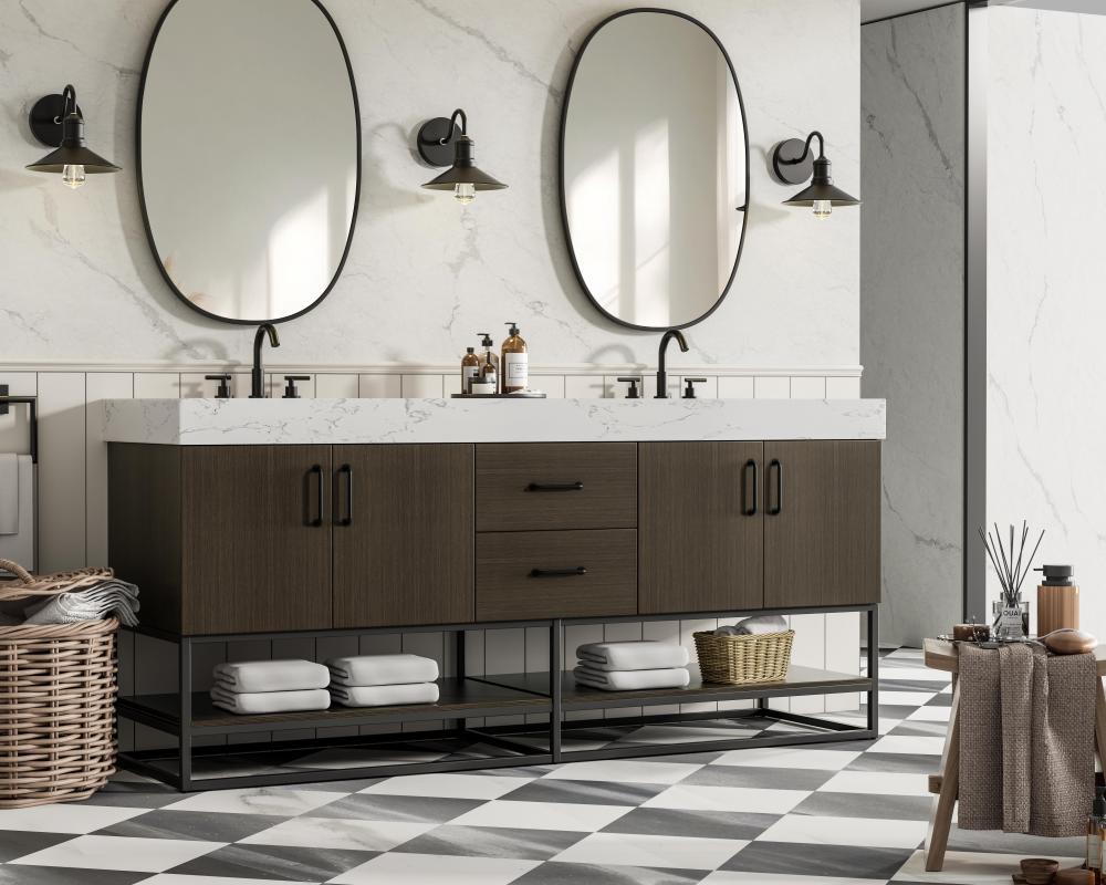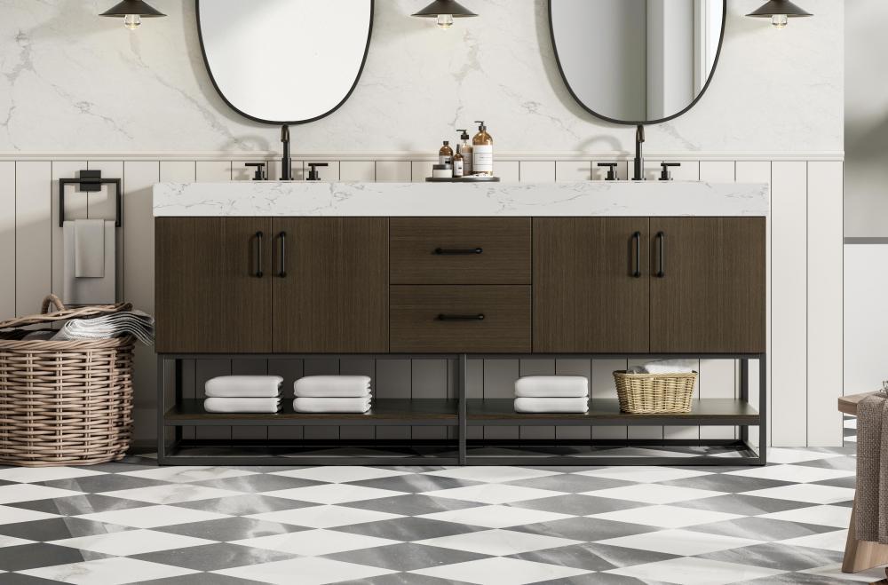 This transitional bathroom vanity is available in five curated finishes to suit any style: Crisp White for timeless elegance, Sleek Grey for a modern touch, Mocha Brown for a rich, luxurious feel.