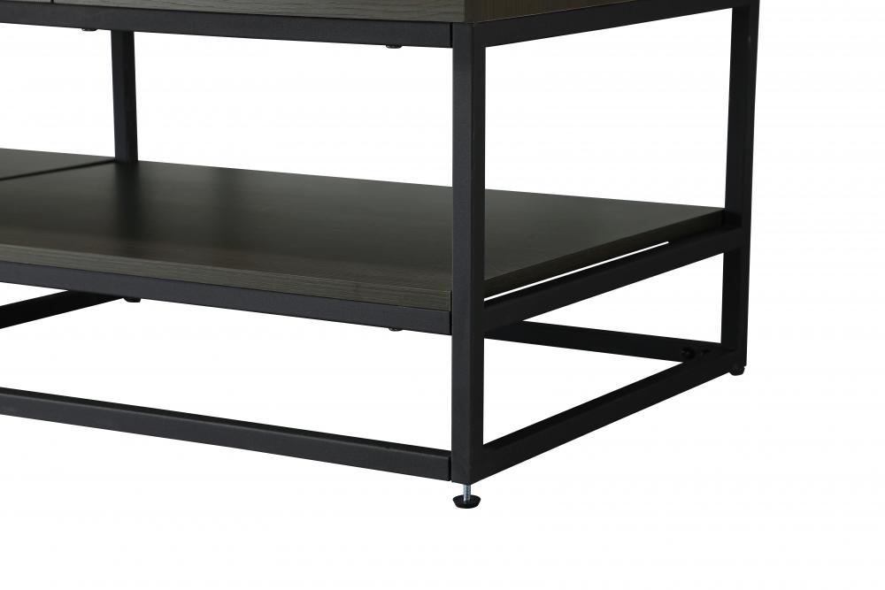 A matching open wood shelf at the bottom provides ample space for storage and decor, supported by slender black metal legs with a 14-inch clearance, combining both practical function and a contemporary edge.