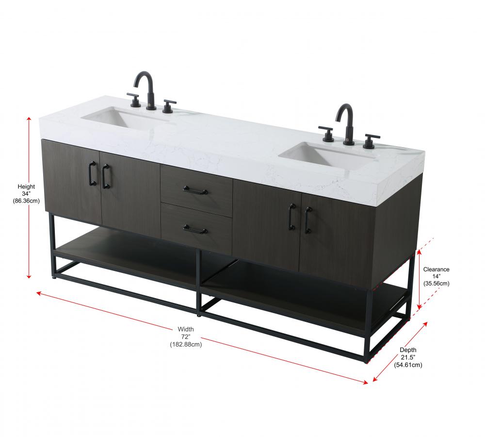 Upgrade your bathroom with this stylish transitional vanity, available in five stunning finishes, from crisp white to warm honey brown, designed to suit a variety of decor styles. The minimalist flat door panels and open wood shelf create a functional yet visually appealing storage solution, while the slender black metal legs elevate the look with modern sophistication. The 4-inch thick white engineered marble countertop, accented with natural veining, adds a luxurious touch, perfectly complemented by soft-closing doors with sleek black metal bar pulls. Thoughtful details like the concealed overflow, back panel cutout for plumbing, and 3 pre-drilled holes for an 8-inch faucet make installation easy and efficient. with a porcelain sink and farmhouse-inspired touches, this vanity brings both elegance and practicality to any bathroom setting.