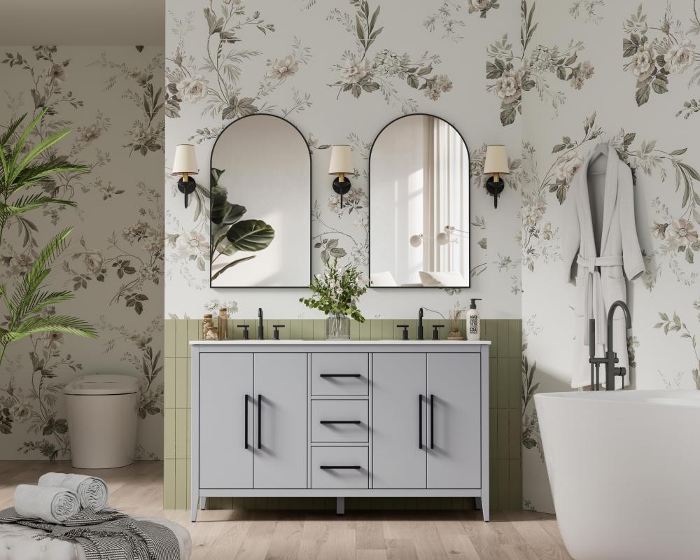 The vanity stands on tapered 5-inch solid wood legs with levelers for a balanced, polished look, combining modern style with practicality.