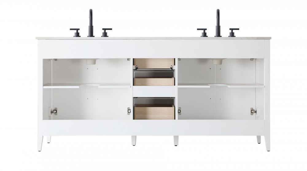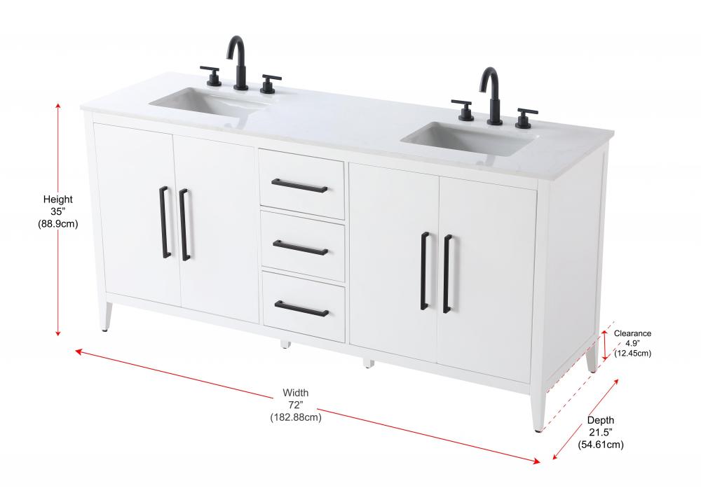 Bring both elegance and practicality to your bathroom with this transitional vanity, available in a selection of rich finishes that highlight the beauty of faux wood grain in shades of mocha, chestnut, and honey, along with classic white and modern grey. The flat door panels and sleek black metal pulls create a minimalist yet refined aesthetic, while the soft-closing drawers and tapered legs with levelers provide smooth, functional operation. Topped with a luxurious white engineered marble countertop and featuring a porcelain sink, this vanity combines timeless style with modern efficiency. Thoughtfully designed with U-shaped cutout for plumbing, it offers ample storage and easy installation, making it the perfect centerpiece for any bathroom.